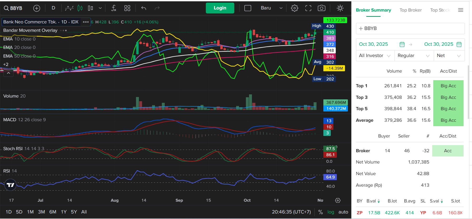 BBYB ditutup di Rp410 (+4,06%) dengan akumulasi besar oleh investor institusi, menandakan minat beli kuat dan potensi kelanjutan tren naik. Harga berhasil menembus EMA 20 dan EMA 50, memperkuat momentum bullish jangka pendek. MACD positif dan RSI di 64,9 menunjukkan tren penguatan masih sehat selama harga tidak menembus area support.