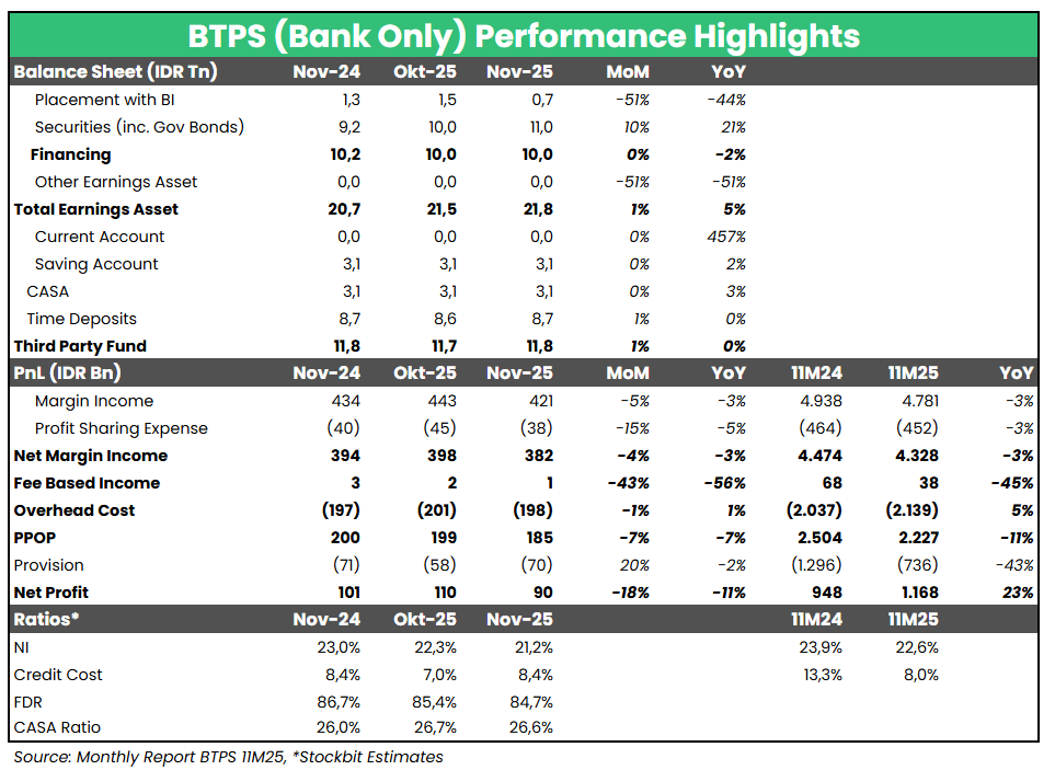Bank BTPN Syariah ($BTPS) mencatat laba bersih bank only sebesar Rp90 M pada November 2025 (-11% YoY, -18% MoM), menandai penurunan kinerja bulanan secara tahunan yang pertama sepanjang 2025. Hasil ini membuat laba bersih bank only BTPS selama 11M25 mencapai Rp1,2 T (+23% YoY), setara 93% estimasi 2025F konsensus (vs. 11M24: 89% realisasi konsolidasi tahunan).