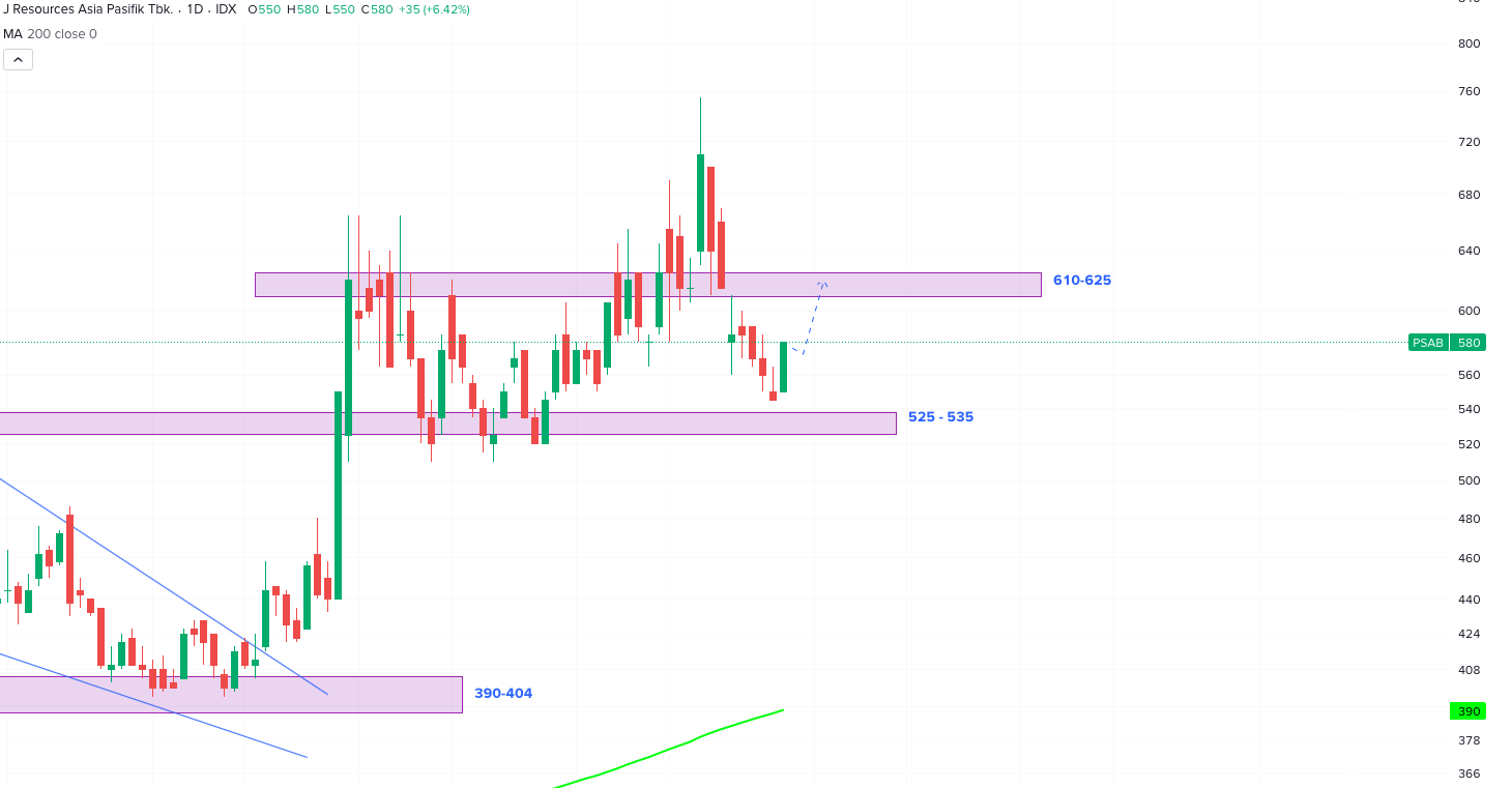 Not recommended buat buy sekarang.. Better buy on weakness kalau dia koreksi ke support 525-535, atau tunggu breakout dari 625 sekalian