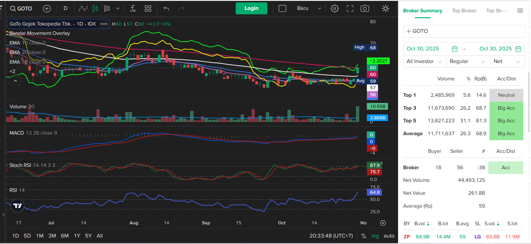 GOTO menunjukkan sinyal pemulihan teknikal setelah ditutup di Rp60 (+7,14%) dengan akumulasi besar oleh investor institusi. Harga berhasil menembus area konsolidasi dan mendekati EMA 50, disertai peningkatan volume yang signifikan. Indikator MACD mulai positif dan RSI 64,8 menandakan momentum bullish mulai terbentuk selama harga mampu bertahan di atas support.