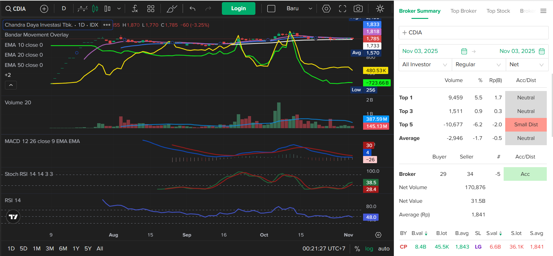 Broker summary: mayoritas Neutral, tapi total masih Acc kecil → ada minat akumulasi awal.