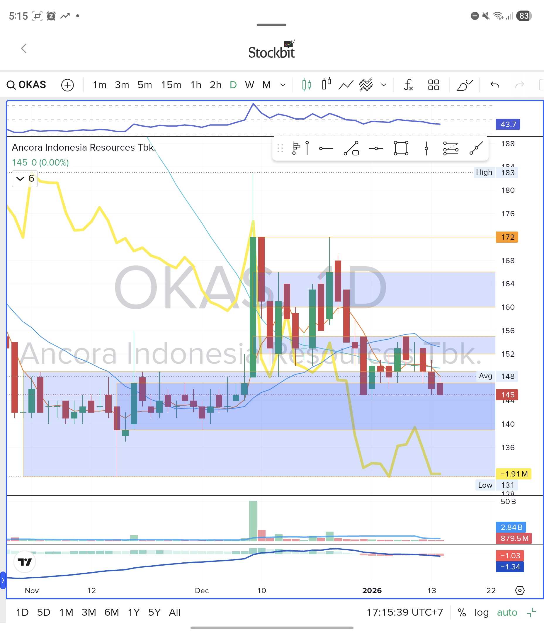 BUKA lagi di fase abu-abu. Harga di sekitar 158, stuck di area equilibrium. Volume turun, candle kecil2, market lagi nunggu arah.