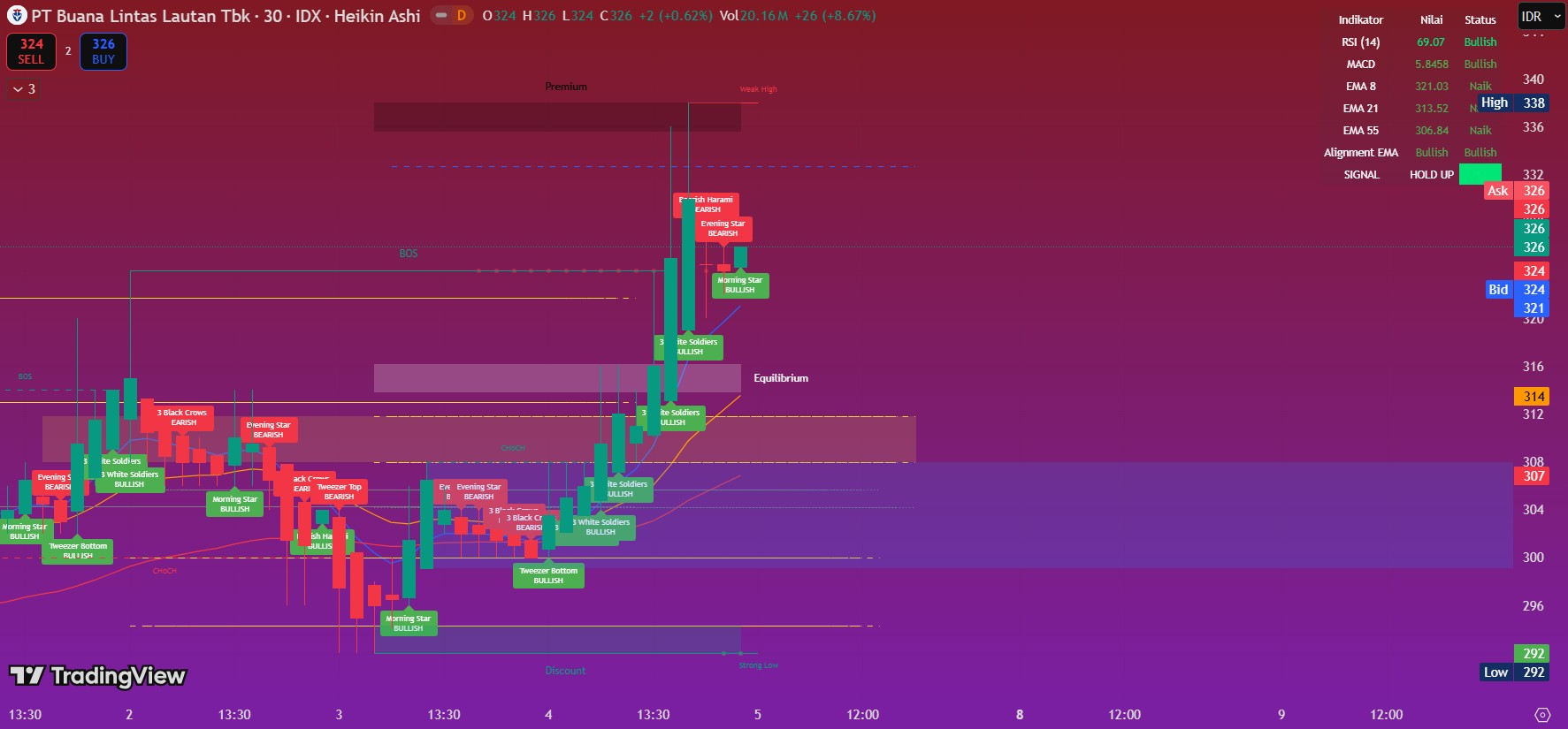 ➡️ Break di atas 326 dengan volume besar → sinyal valid untuk entry ulang.