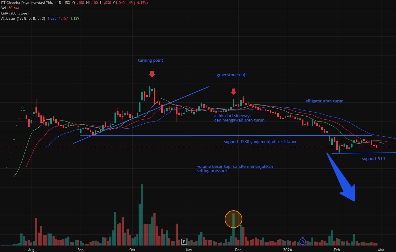Melanjutkan analisa $CDIA (https://stockbit.com/post/27208363), terlihat saham ini masih dalam distribusi berat dan ketika IHSG rebound, support terakhir 1.280 yang menjadi resistance tidak berhasil dilewati dan saat ini mulai melanjutkan penurunan dan kita perlu mewaspadai support 910. Apabila level ini ditembus, maka penurunan bisa sangat dalam dan karena volume relatif kecil, maka tipe penurunan ini bukan secara cepat tapi diiris perlahan jadi waktu yang diperlukan untuk mencapai bottom akan panjang. Porsi masyarakat memang terlihat kecil (hanya 10%) namun karena jumlahnya banyak yaitu 12.4 milyar dan per Januari baru 9.331 investor yang exit (masih ada 47.000 sejak Oct 2025), sangat mungkin CDIA akan melakukan strategi buyback dengan menunggu di 2-3 minggu terakhir (sekitar akhir April) sambil menunggu harga turun lebih dalam (agar ongkos buyback lebih murah).