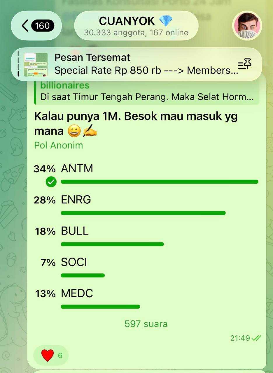 Kalo mau entry, jgn terpengaruh di pompom pompom influenzer. Utamakan cek fundamentalnya mau lewat valuasi atau cek utang (DER). Jadi ga deg2kan kalo harganya fluktuatif.
