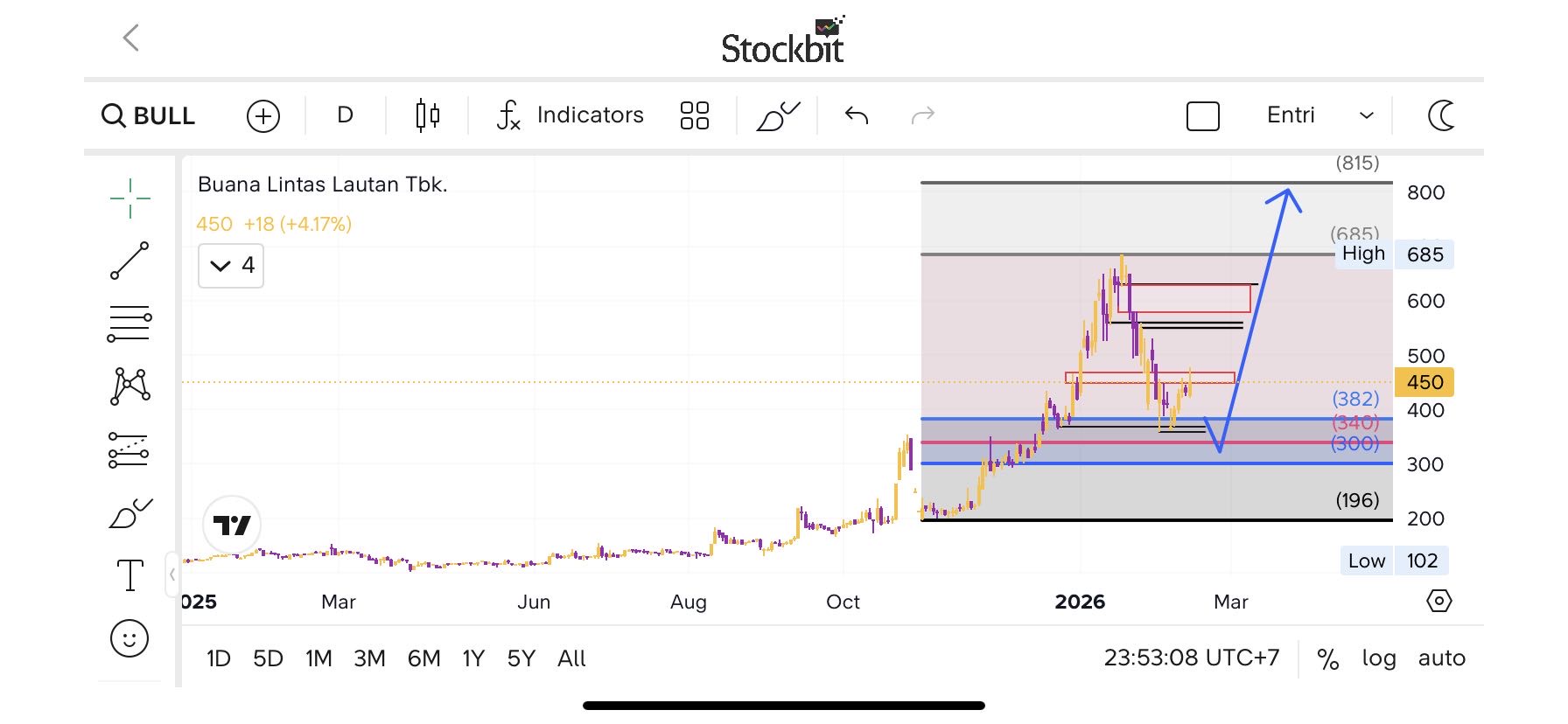 Area yang perlu diperhatikan berikutnya berada di sekitar 600–685. Zona ini adalah supply historis yang sebelumnya menahan kenaikan. Jika harga kembali mendekati area tersebut dengan dukungan volume yang menguat, peluang pembentukan struktur naik baru akan terbuka. Sebaliknya, kegagalan menembus zona supply akan menjaga BULL tetap bergerak dalam fase konsolidasi menengah.