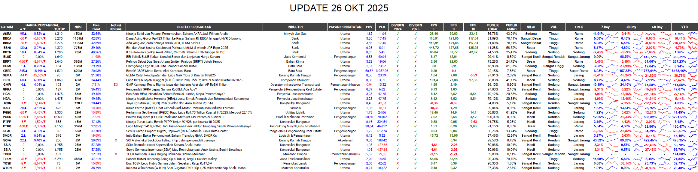 Saham-saham yang lagi rame diperhatiin pasar — $GOTO, $BREN, CLEO, BBNI, $BUMI, dan AGRO (update per 31 Oktober 2025).