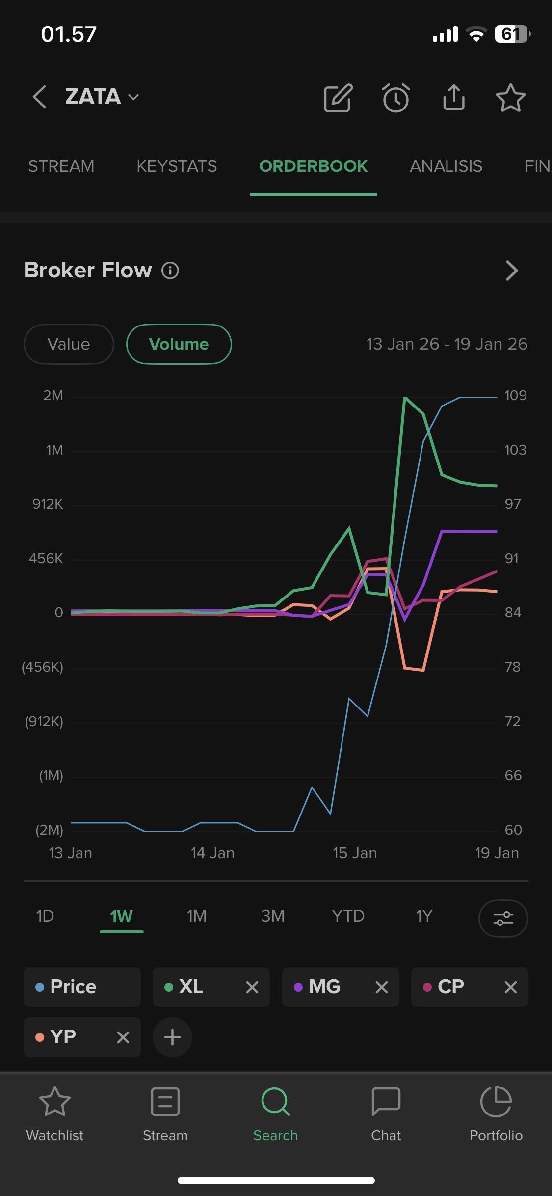 Secara volume ZATA seharusnya besok tanggal 20 januari 2025 masih bisa untuk lock ara, YP & CP rutin sudah 2 hari akumulasi trus < meskipun ada buangan dri YP sebesar 1.3B & dri CP 223M > seperempat dri akuman YP & hampir setengah dri akuman CP. Dan faktor pendukung MG juga ikut mengakumulasi mulai hari ini sebesar 3/4B di AVG 101.