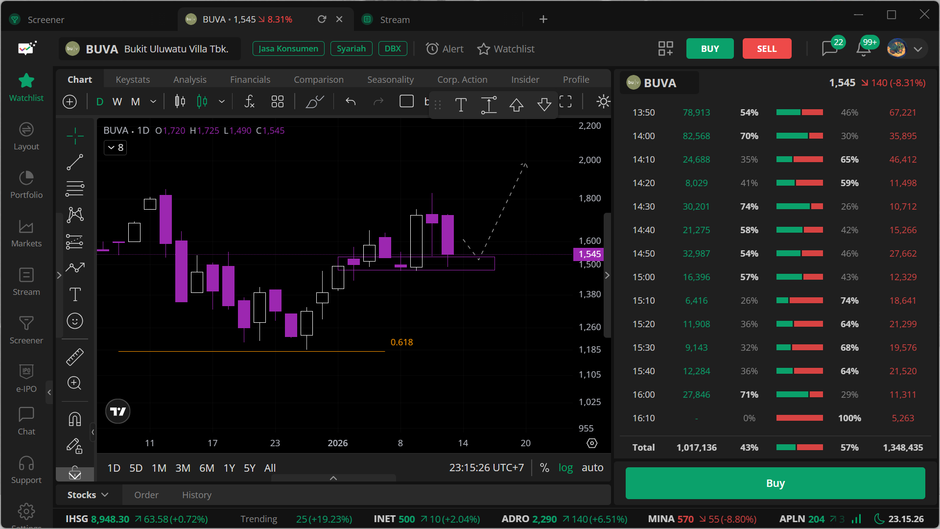 👉 IMPACT: BUVA volatil dengan range 1,535-1,830 pada 12 Januari. Hari ini (13 Jan) terkoreksi -8.31% ke 1,545 seiring profit taking massal saham konglomerasi saat IHSG sempat crash -2.48%. Koreksi healthy setelah lonjakan 15.44% ke 1,720 sehari sebelumnya. Analis merekomendasikan Buy on Weakness dengan proyeksi masuk wave [iii] dari Elliott Wave 5.