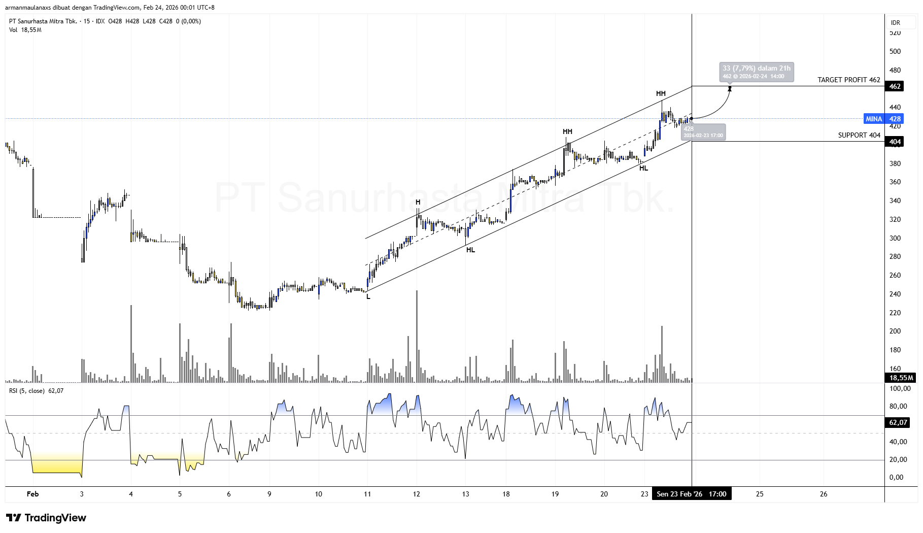 Trading Plan PT Sanurhasta Mitra Tbk ($MINA) – 15M: Harga bergerak dalam trend channel naik dengan struktur higher high & higher low, saat ini konsolidasi di area 428; selama bertahan di atas support 404, potensi kenaikan ±7–8% menuju target 462 masih terbuka. RSI(5) ~62 menunjukkan momentum masih positif tanpa kondisi jenuh beli ekstrem. Entry ideal 420–430 dengan stop loss di bawah 404; setup ini bullish continuation dalam channel. Disclaimer: hanya untuk edukasi & analisis, bukan ajakan investasi.