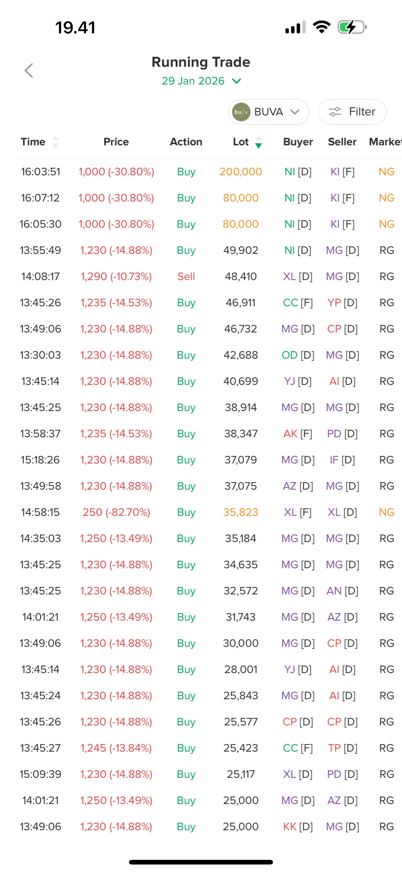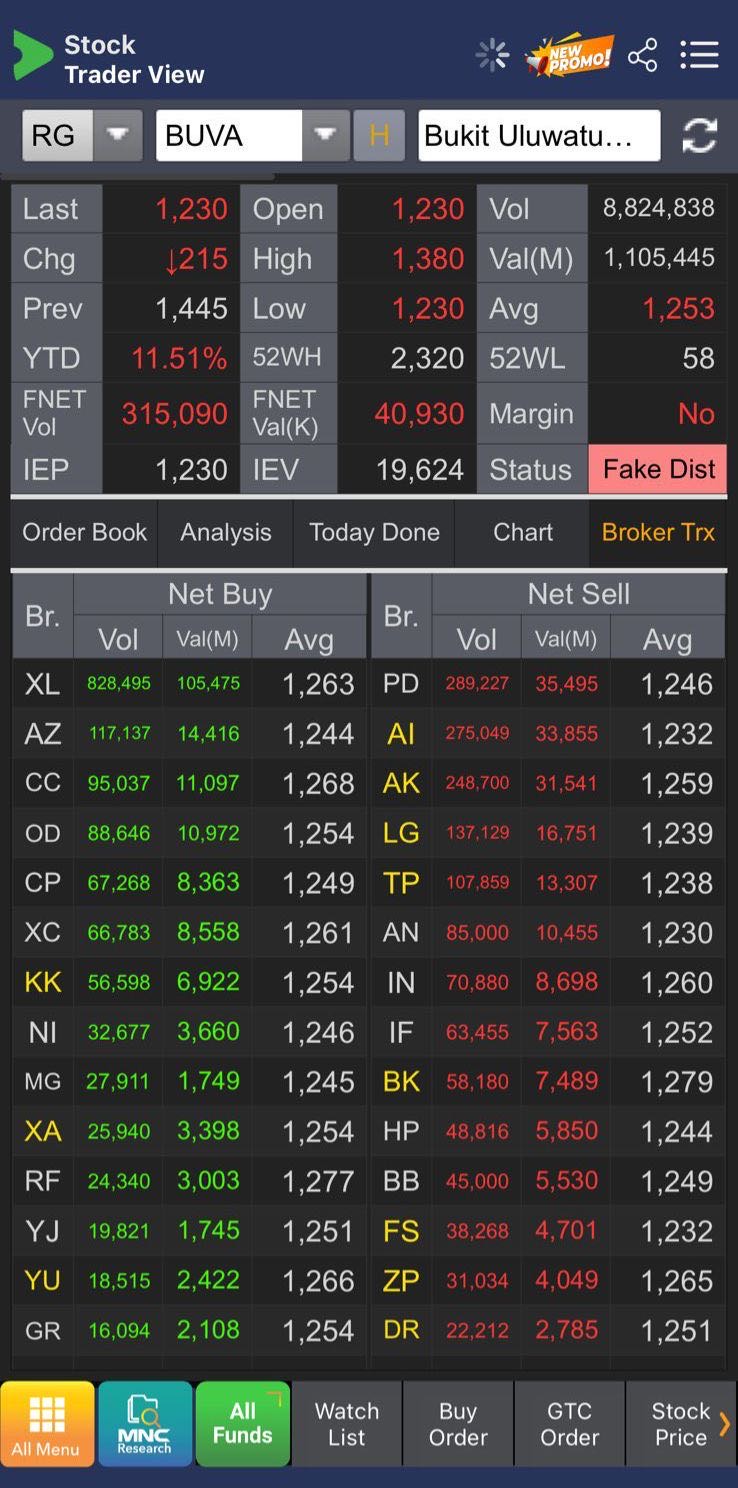 $BUVA dipukul bolak balik hingga ARB g ketarik dipikir ada bandar yg lagi jualan/ take profit. Dari Running Trade ternyata bukan hanya 1 broker saja tapi hampir rata semua broker yg jualan karena tekanan psikologis besok akan turun lagi.