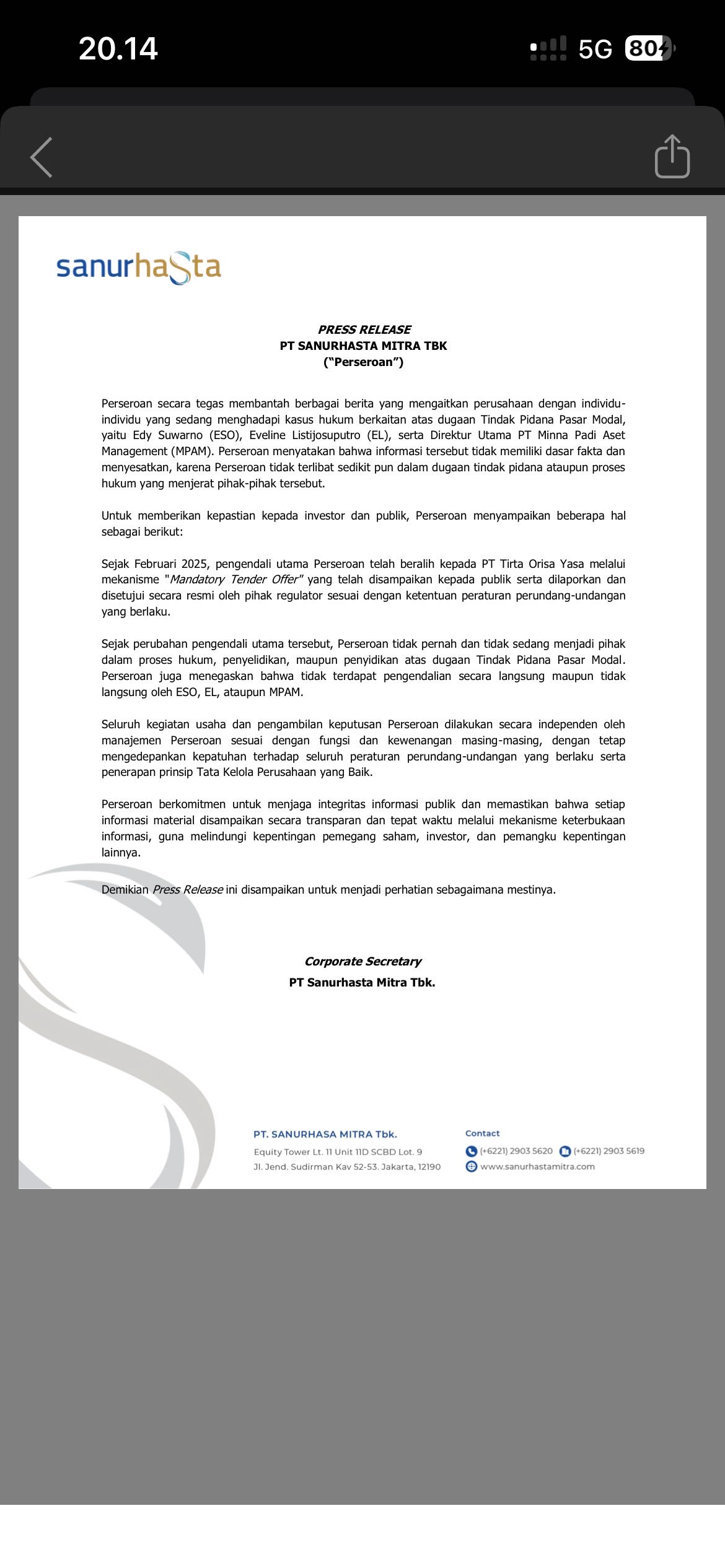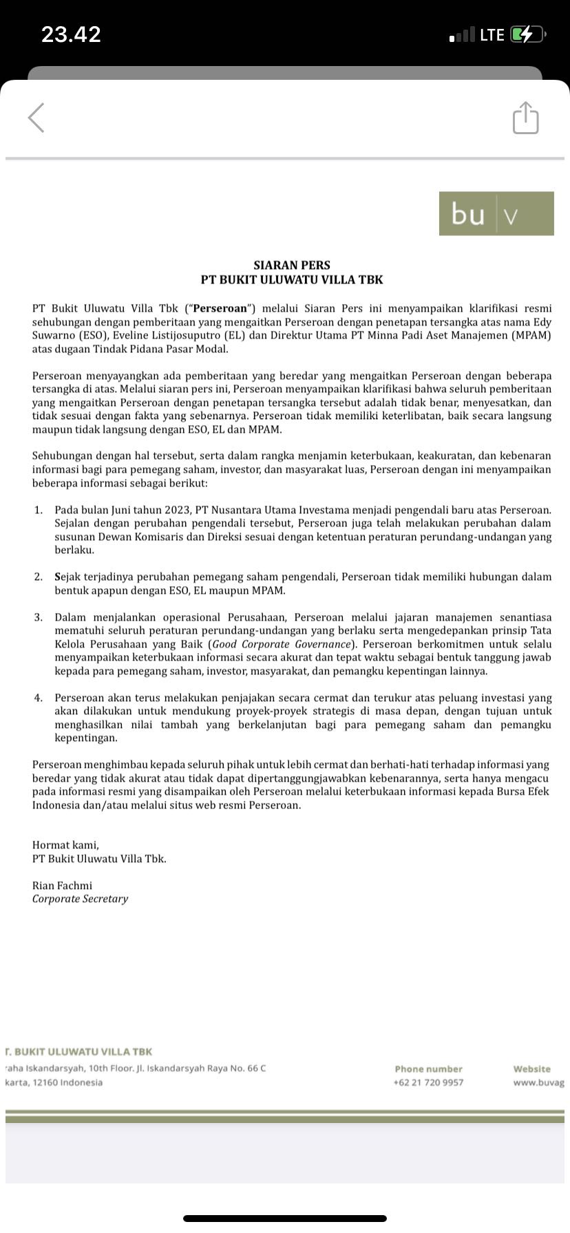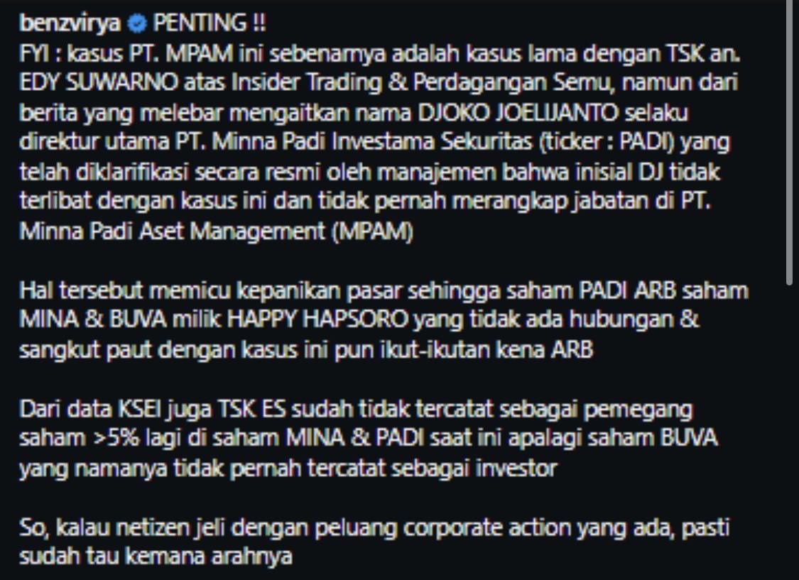 IDXChannel - PT Bukit Uluwatu Villa Tbk (BUVA) dan PT Sanurhasta Mitra Tbk (MINA) menyatakan, tidak memiliki keterlibatan dalam kasus dugaan Tindak Pidana Pasar Modal yang melibatkan PT Minna Padi Aset Manajemen (MPAM).