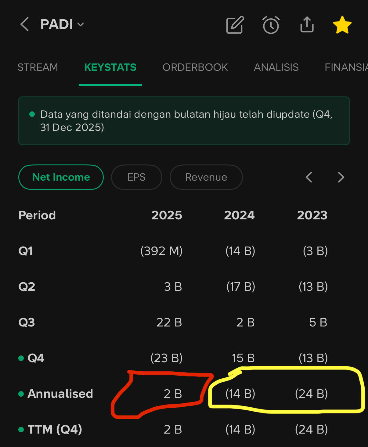 $PADI laporan keuangan Q4 nya meskipun turun, tapi jika dilihat secara keseluruhan (annualised) keuangannya mengalami turnaround dari tahun 2024 & 2023