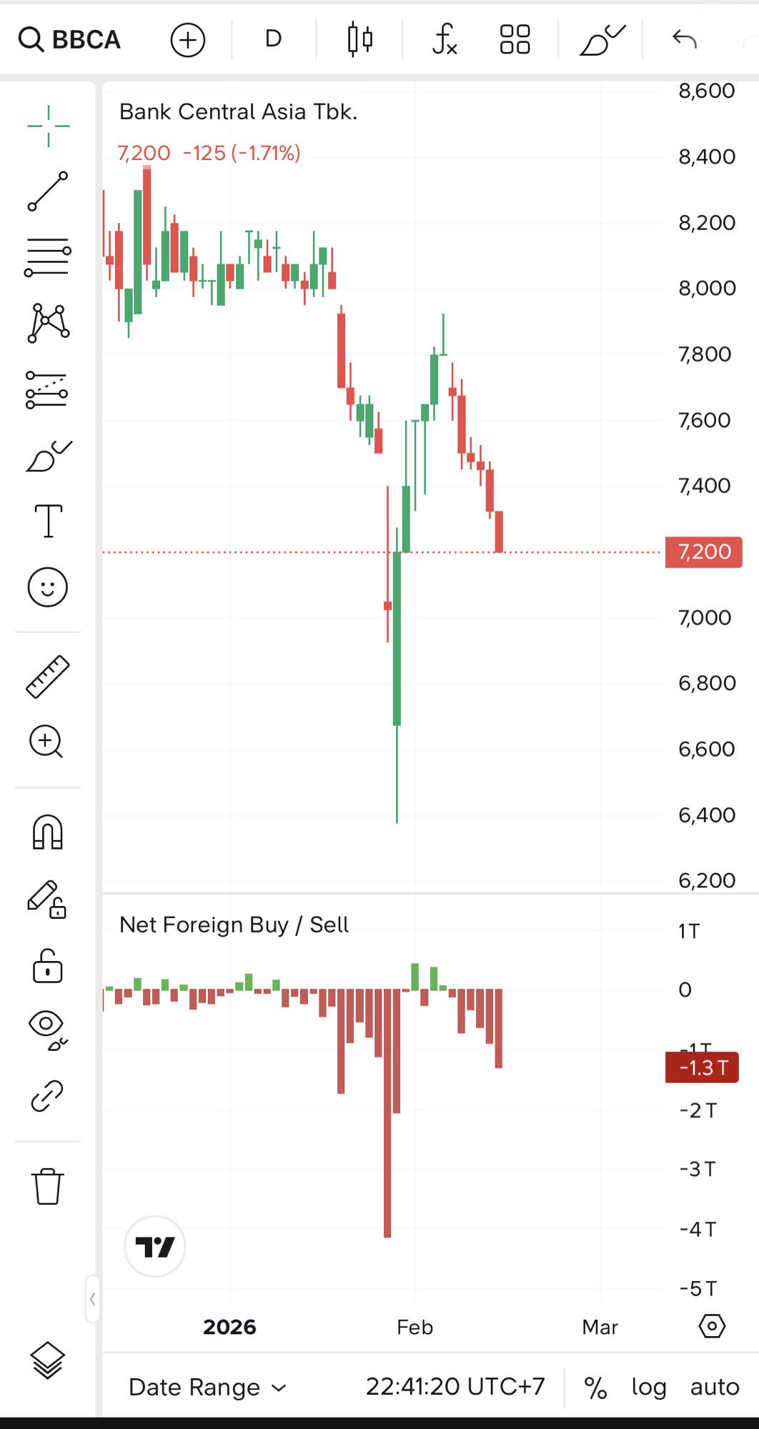 Secara teknikal, harga BBCA sudah menembus level psikologis penting di area 7.400-an. Begitu harga jebol ke bawah, sistem perdagangan otomatis dan algoritma institusi biasanya memicu aksi jual lanjutan (panic selling) yang membuat grafiknya terjun bebas seperti yang kita lihat sekarang.