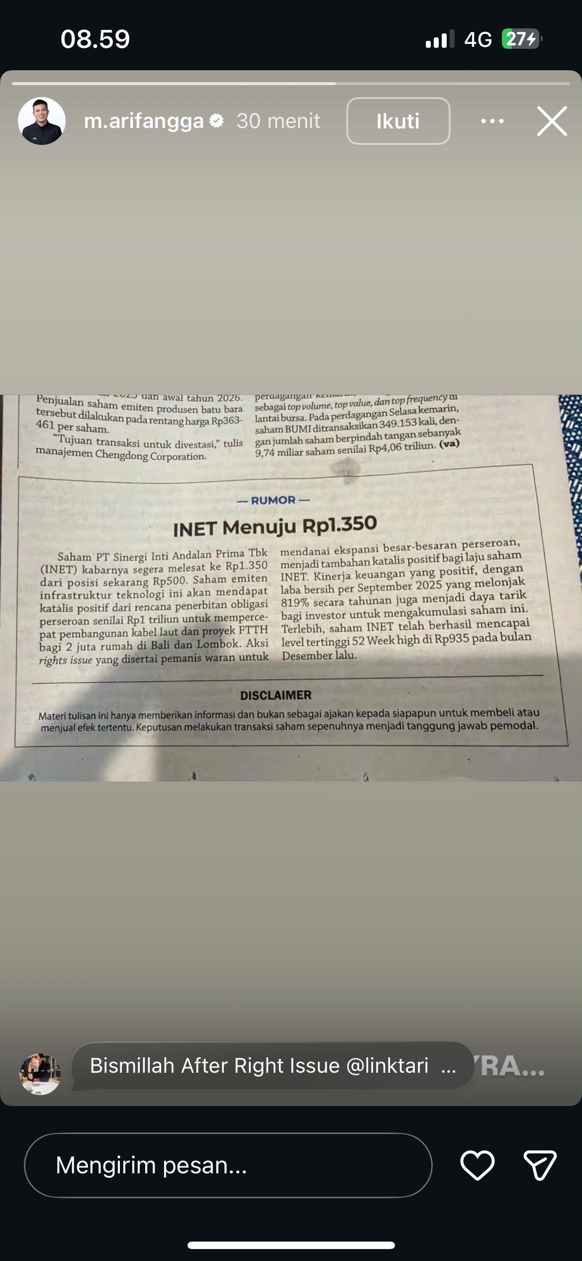 $INET kata ceo inet bakalan naik 1350 setelah selesai RI nya mangka nya sekarang koreksi dulu kalau blm dpt sekarang lagi diskon inet $BUVA $BUMI