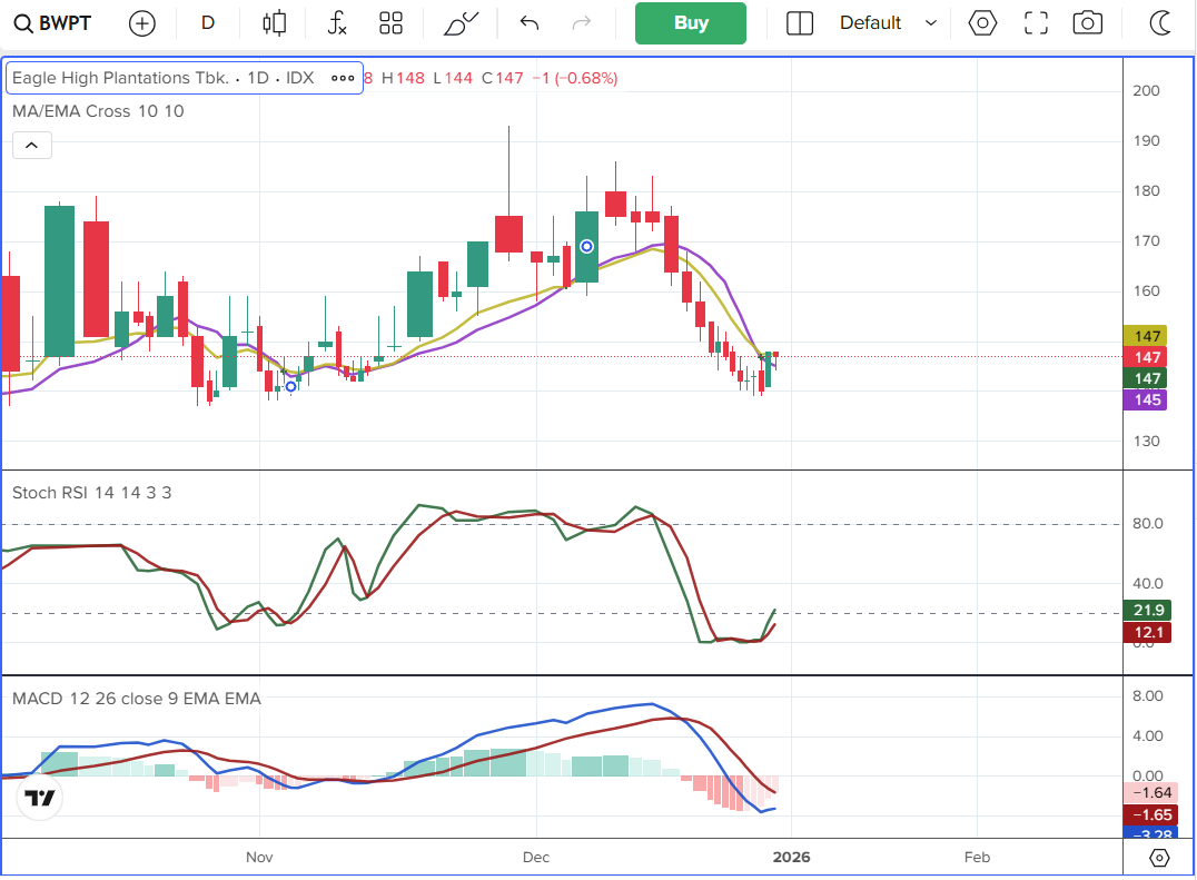 Volum penjualan jangka panjang udah melandai dari histogram MACD, artinya udah penjenuhan daya jual jangka panjang dan indikasi grafik oversold... good to collect. Posisi sekrang koreksi sehat di 146, good entry, dengan target terdekat di 170.