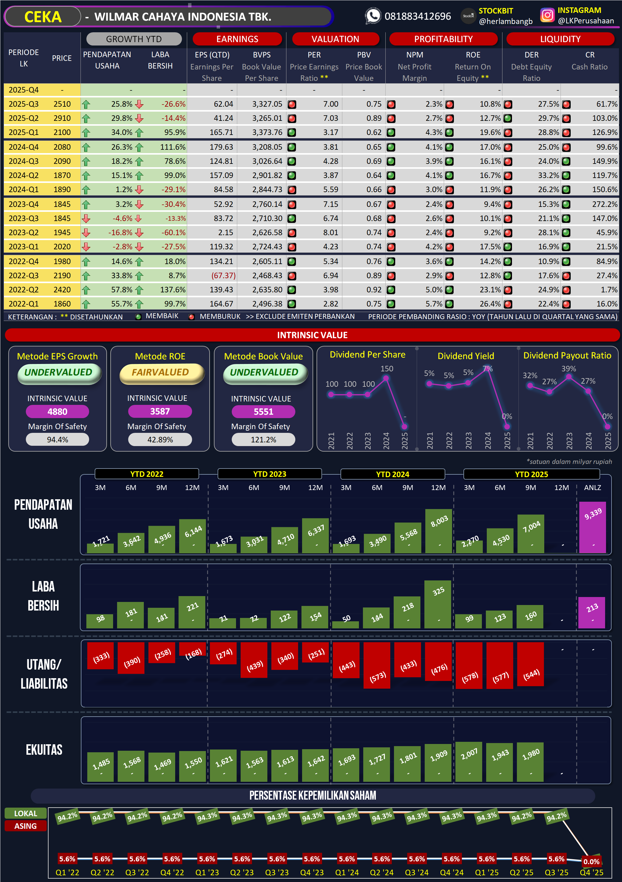 $CEKA pada Q3 2025 membukukan Laba Bersih Rp 37 B atau turun -50.29% dibanding Q3 2024 sebesar Rp 74 B. Pada perdagangan saat ini, PE Ratio (TTM) perseroan berada di level 5.55x.