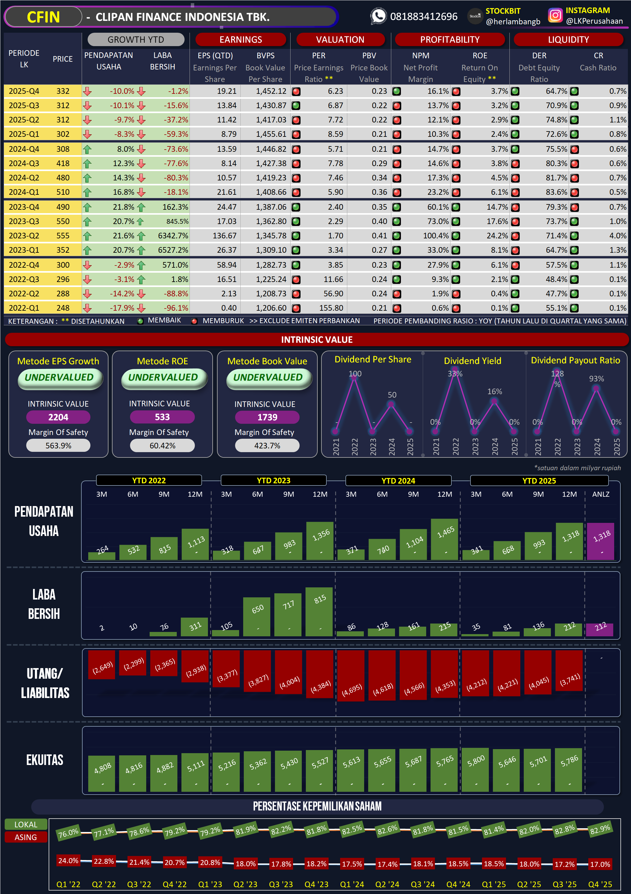 *Saran Tindakan:* Jika Anda adalah *Growth Investor* yang mencari pertumbuhan pendapatan meroket, saham ini mungkin kurang cocok untuk saat ini. Namun, jika Anda adalah *Value Investor* atau pencari dividen (*Dividend Hunter*) yang menyukai saham dengan fundamental super aman, rasio utang yang terus mengecil, dan royal membagikan hasil kasnya, CFIN sangat layak dipertahankan atau diakumulasi saat harganya sedang terdiskon di pasar. Tetap pantau arah penyaluran kredit baru mereka di kuartal berikutnya, dan selalu sesuaikan profil risiko Anda! Selamat berinvestasi!