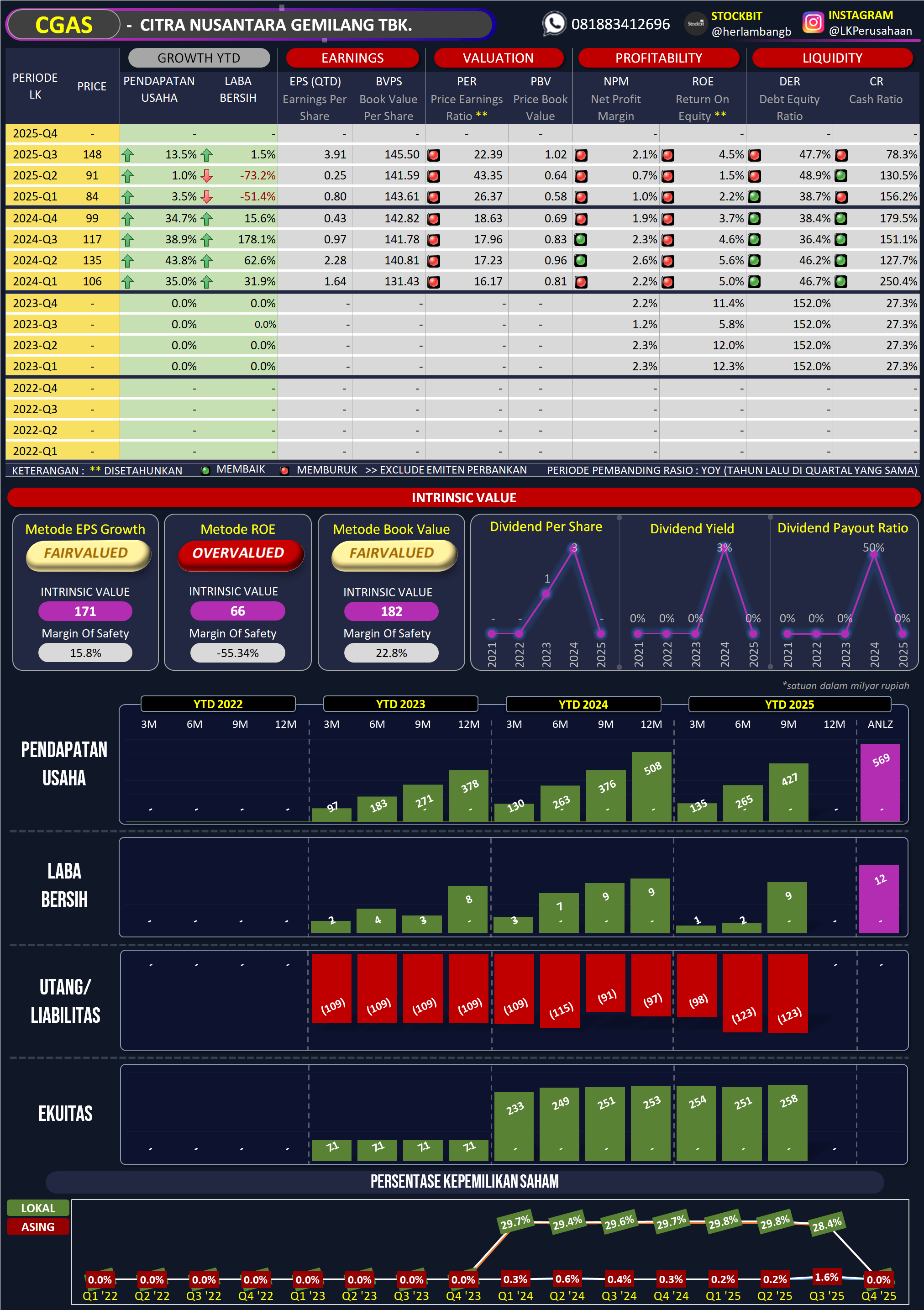 Citra Nusantara Gemilang Tbk. (CGAS) didirikan berdasarkan Hukum Negara Republik Indonesia berkedudukan di Kabupaten Bekasi dengan nama PT Citra Nusantara Gemilang. CGAS dikenal sebagai perusahaan pelopor yang memfokuskan pada pengembangan gas alam terkompresi (Compressed Natural Gas / CNG) di Indonesia melalui kegiatan usaha perdagangan dan distribusi gas alam yang menggunakan moda transportasi ke daerah-daerah yang belum terjangkau oleh jaringan pipa gas dengan tekanan gas yang stabil dan aman. Gas alam ini digunakan untuk keperluan industri, transportasi, perumahan, dan pembangkit listrik swasta yang menggunakan gas sebagai s... Read More