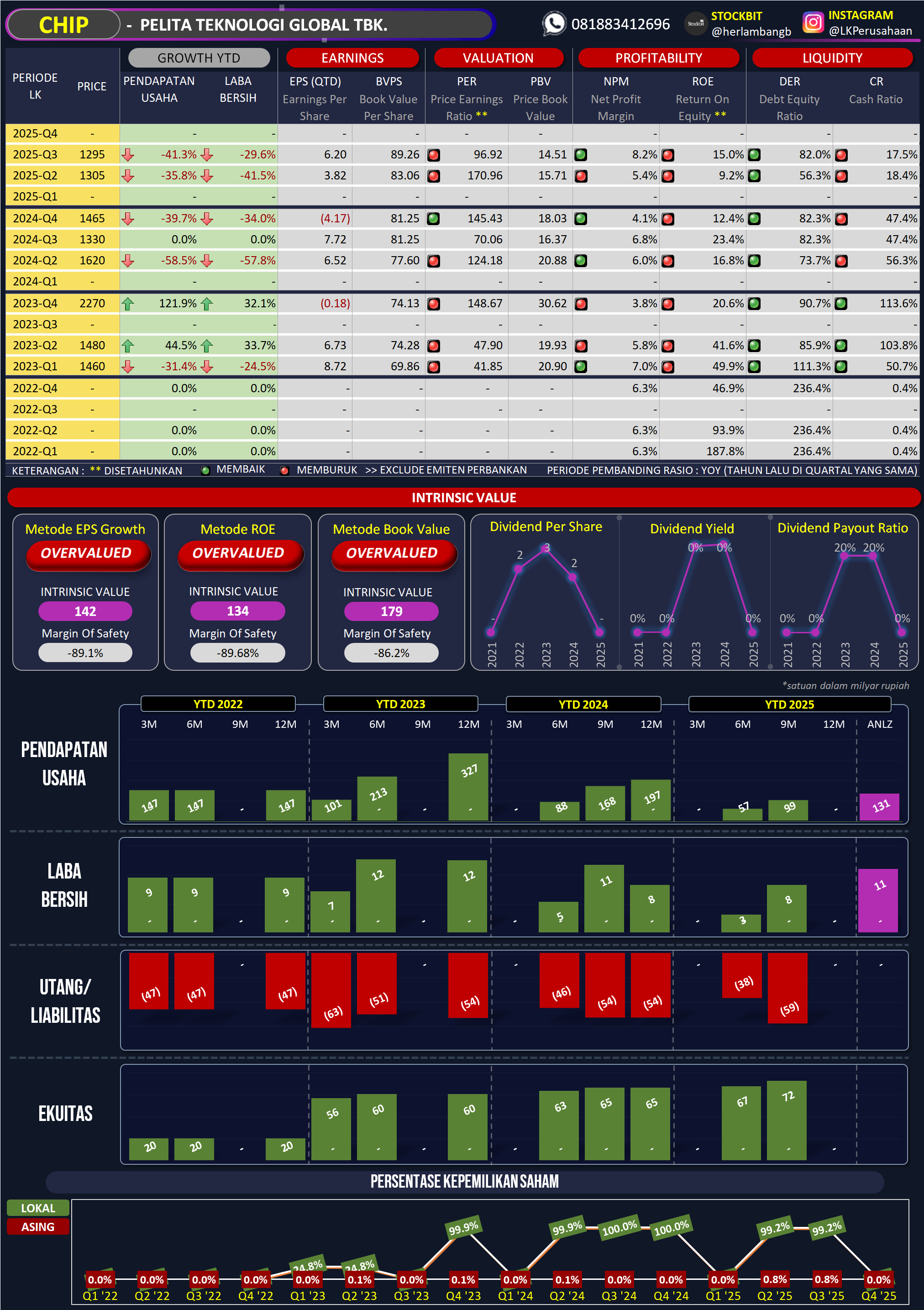 - PBV perusahaan pada 30 Juni 2025 adalah 1,04x, mengindikasikan harga pasar saham sedikit di atas nilai buku perusahaan