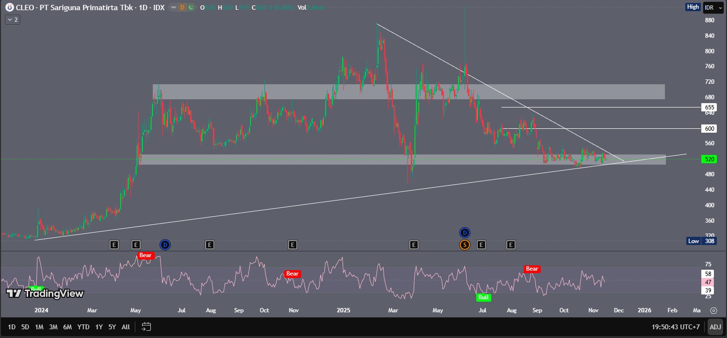 Ada-ada saja emiten yang satu ini, agak berbahaya bila memutuskan masuk di momen seperti sekarang ini, karena harga saham jelas sedang berada di tepi jurang, antara rebound atau terperosok ke bawah harga 500 rupiah per lembar. Namun bila ternyata LK 9M 2025 bagus, maka harga saat ini adalah peluang emas buat memiliki harga base yang relatif aman, karena diprediksi saham CLEO akan rebound begitu terkonfirmasi LK 9M 2025 positif bertumbuh secara kinerja keuangan.