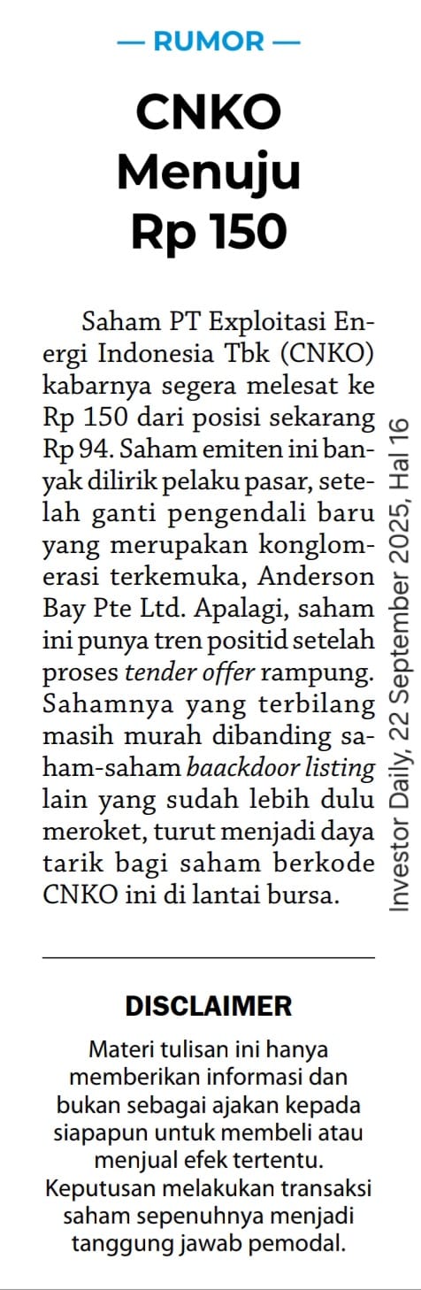 $CNKO kapan keluar dari FCA agan2? monggo infonya yg tau๐๐