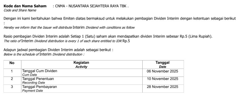 IDXChannel - PT Nusantara Sejahtera Raya Tbk (CNMA) bakal membagikan dividen interim usai mengumumkan kinerja keuangan per 30 September 2025.