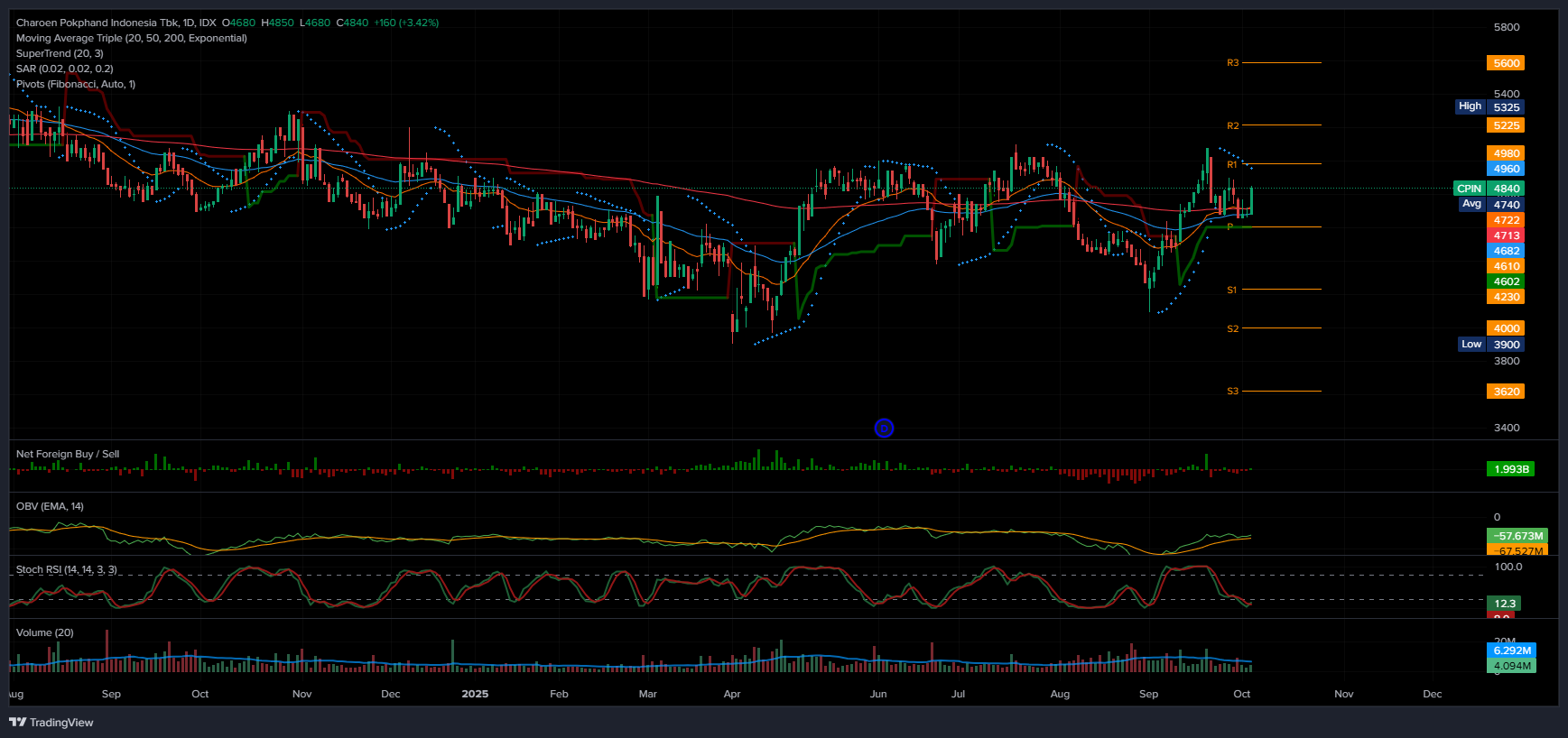 📌CPIN saat ini berada pada fase akumulasi sehat di atas EMA mayor, dengan potensi melanjutkan kenaikan menuju 4.960–5.225 jika breakout berhasil. Selama harga bertahan di atas 4.740–4.600, tren bullish jangka menengah masih valid Cocok untuk swing trade & medium-term hold