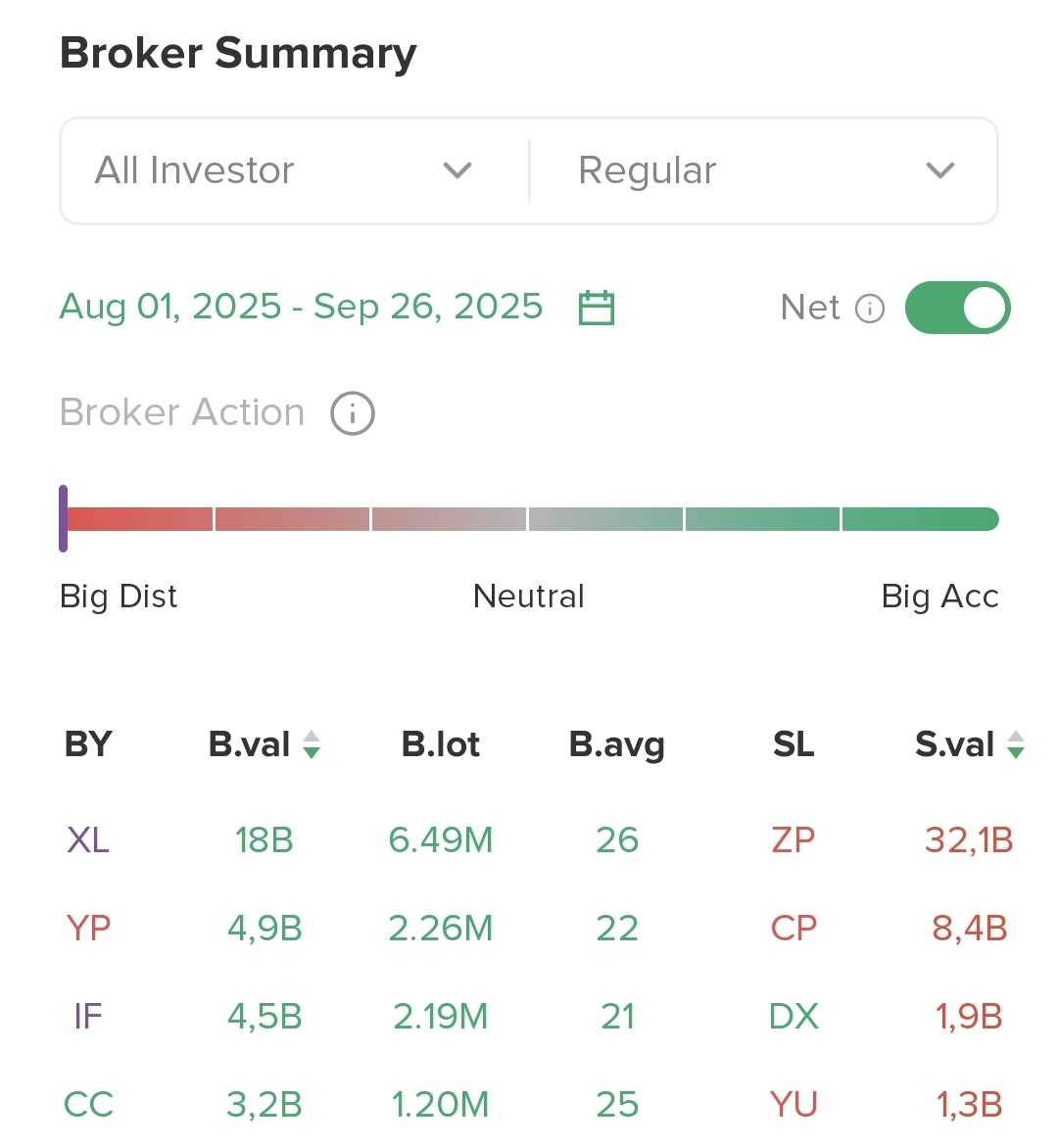 Akumulasi sejak 11 Juli-29 September 2025 di harga 108 PD 3.9 M lot dan XL 2.1 M lot di 106. harga tgl 29 September di 104. Akumulasi hari ini LG 423.8 K Lot di 105