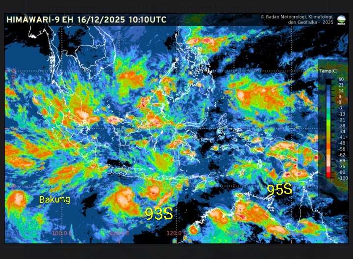➖ Waspada siklon tropis Bakung (barat Lampung dan Jawa), bibit siklon tropis 93S (selatan Bali NTB), dan bibit siklon tropis 95S (selatan Papua).