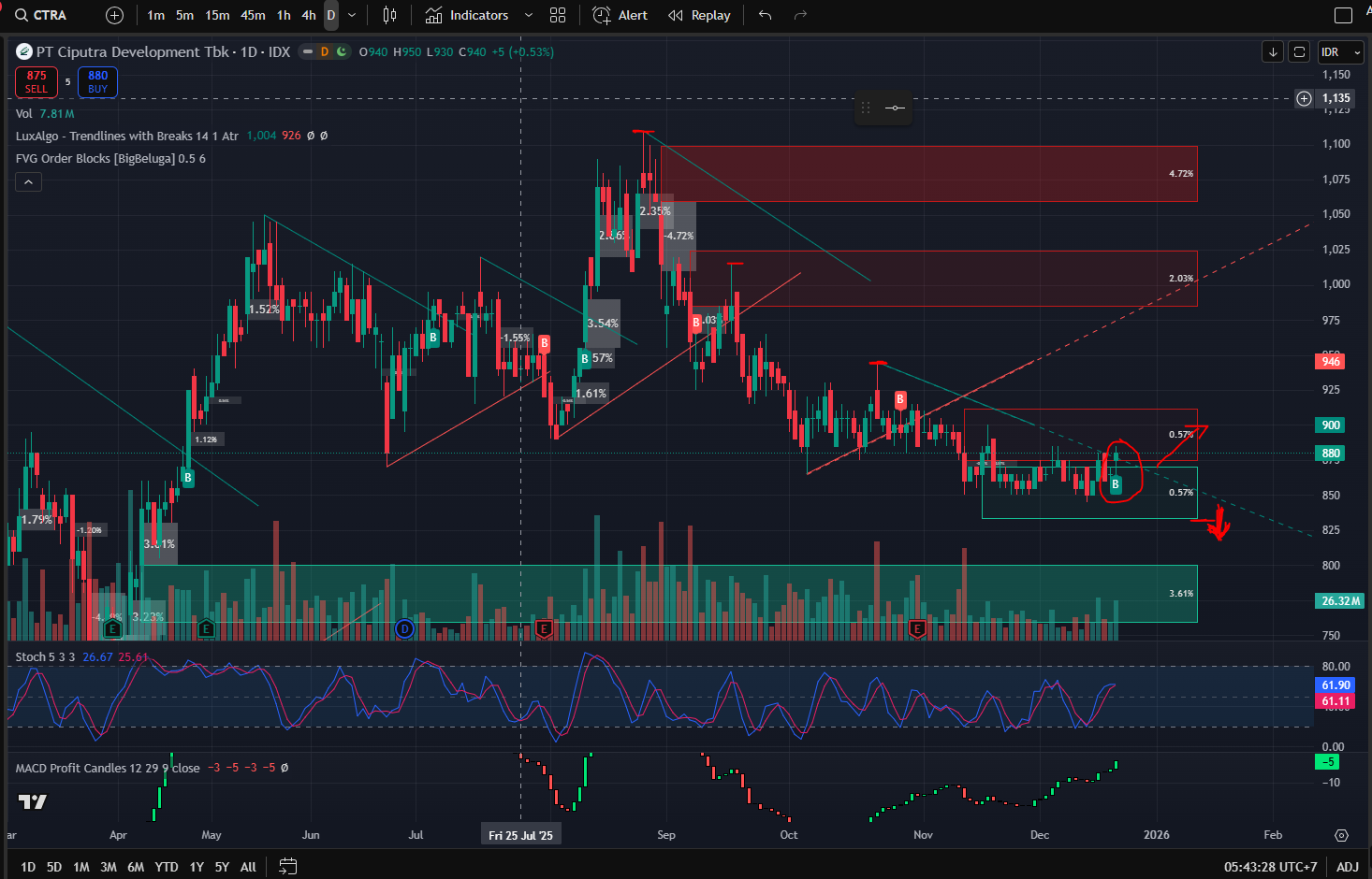 Strategi: Kenaikan hari ini ke 880 adalah sinyal positif awal. Jika besok CTRA mampu bertahan di atas 875, ada potensi terjadi technical rebound menuju area 900-920.
