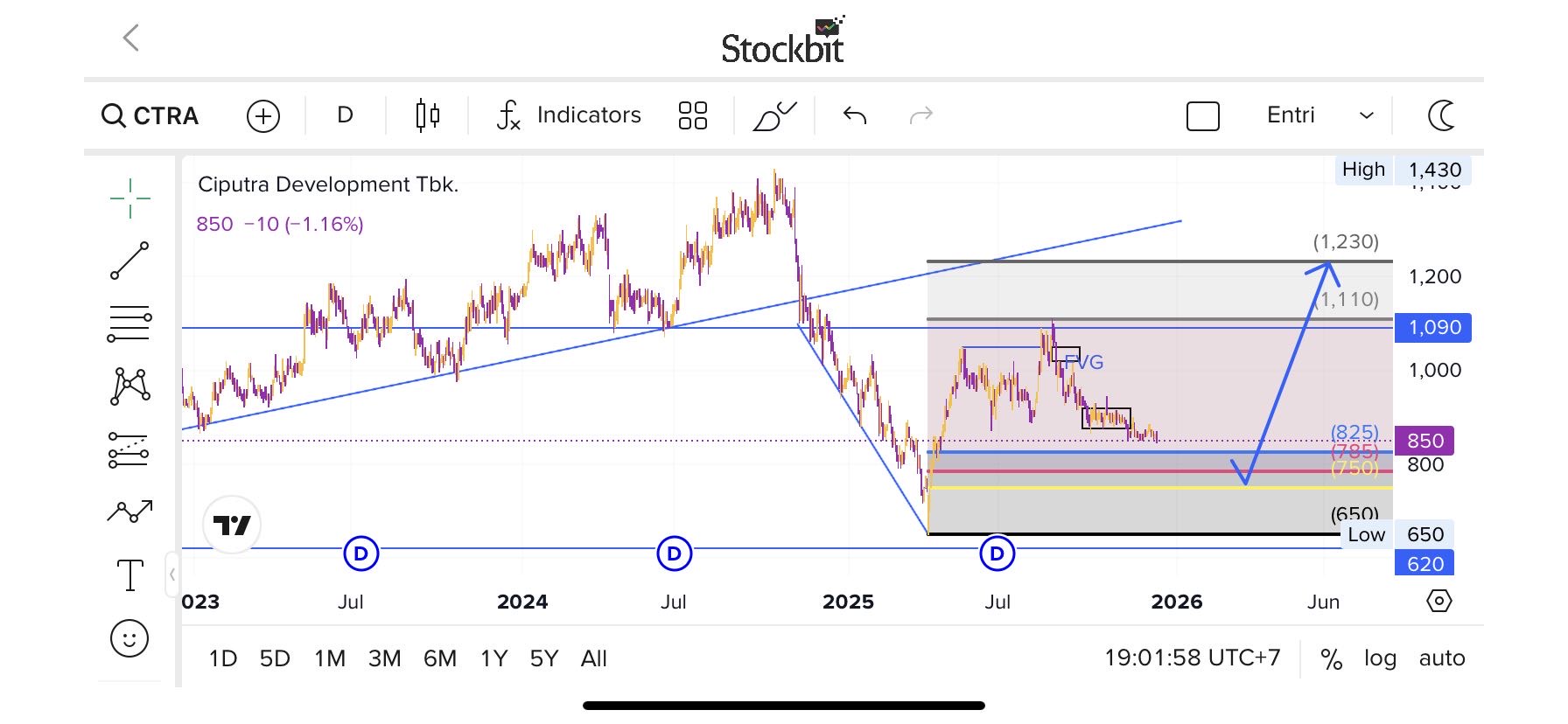 Harga saat ini berada di kisaran Rp 850-860. Ini adalah area support minor yang cukup kuat.