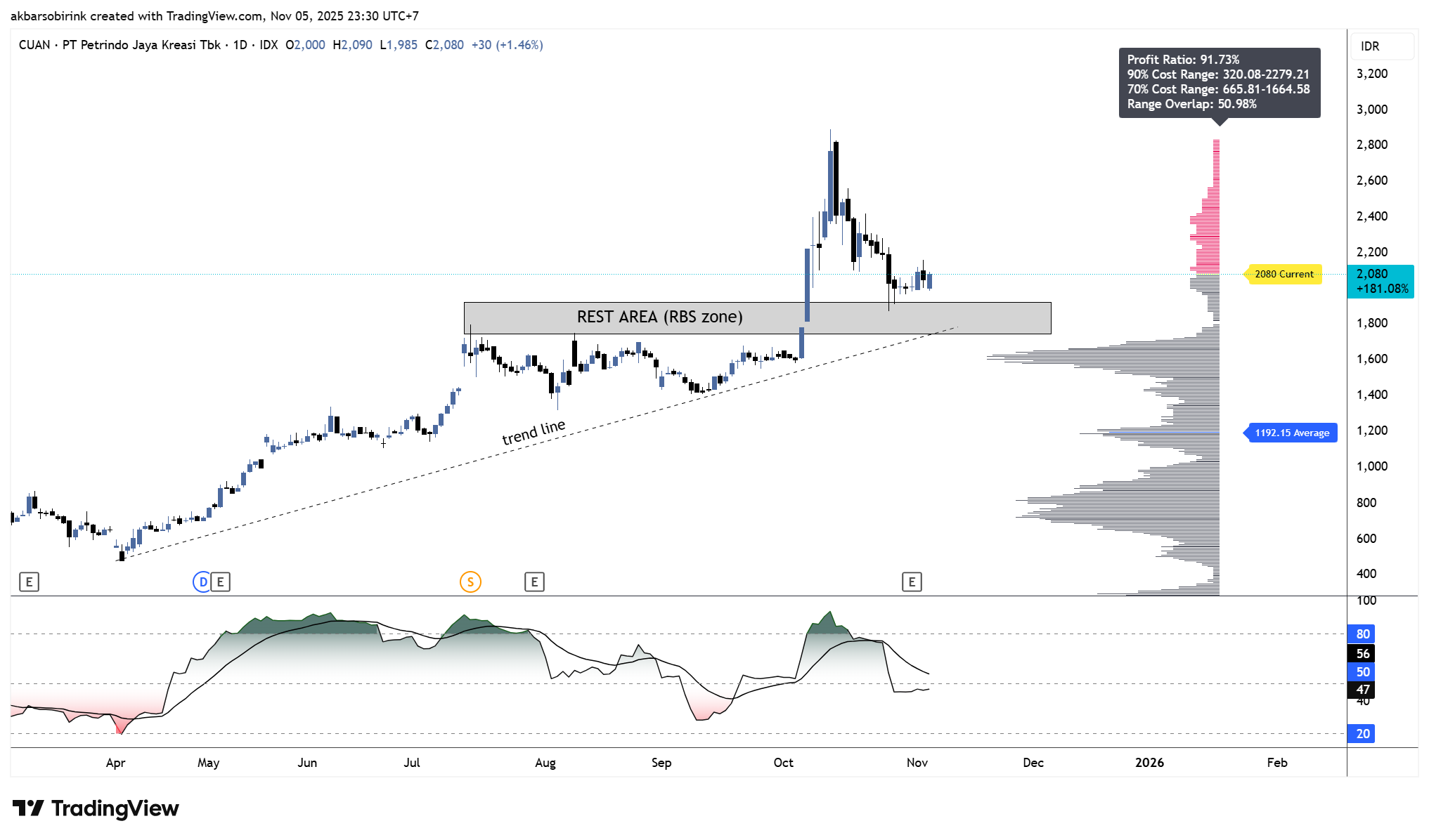 CUAN sedang mencoba reversal teknikal dari fase konsolidasi. Support kuat di 2,000–2,050 perlu dijaga. Jika mampu break 2,150 dengan volume besar, potensi lanjut ke area 2,300 terbuka.