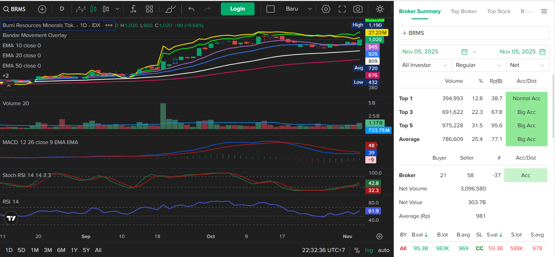 Catatan: BRMS menunjukkan akumulasi besar dan sinyal reversal kuat. Jika mampu bertahan di atas 1,000, potensi lanjut menuju 1,150–1,200 terbuka lebar.