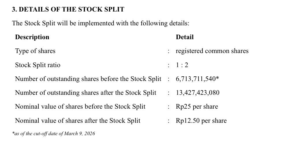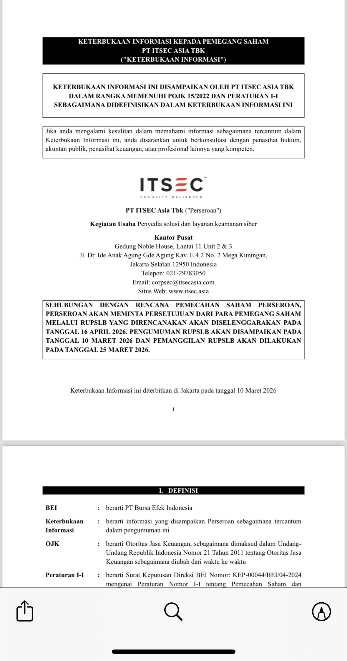 ITSEC Asia ($CYBR) berencana melaksanakan stock split dengan rasio 1:2, dengan jadwal awal perdagangan saham dengan nilai nominal baru di pasar reguler dan negosiasi pada 26 Mei 2026. Rencana ini akan dibahas dalam RUPSLB pada 16 April 2026.
