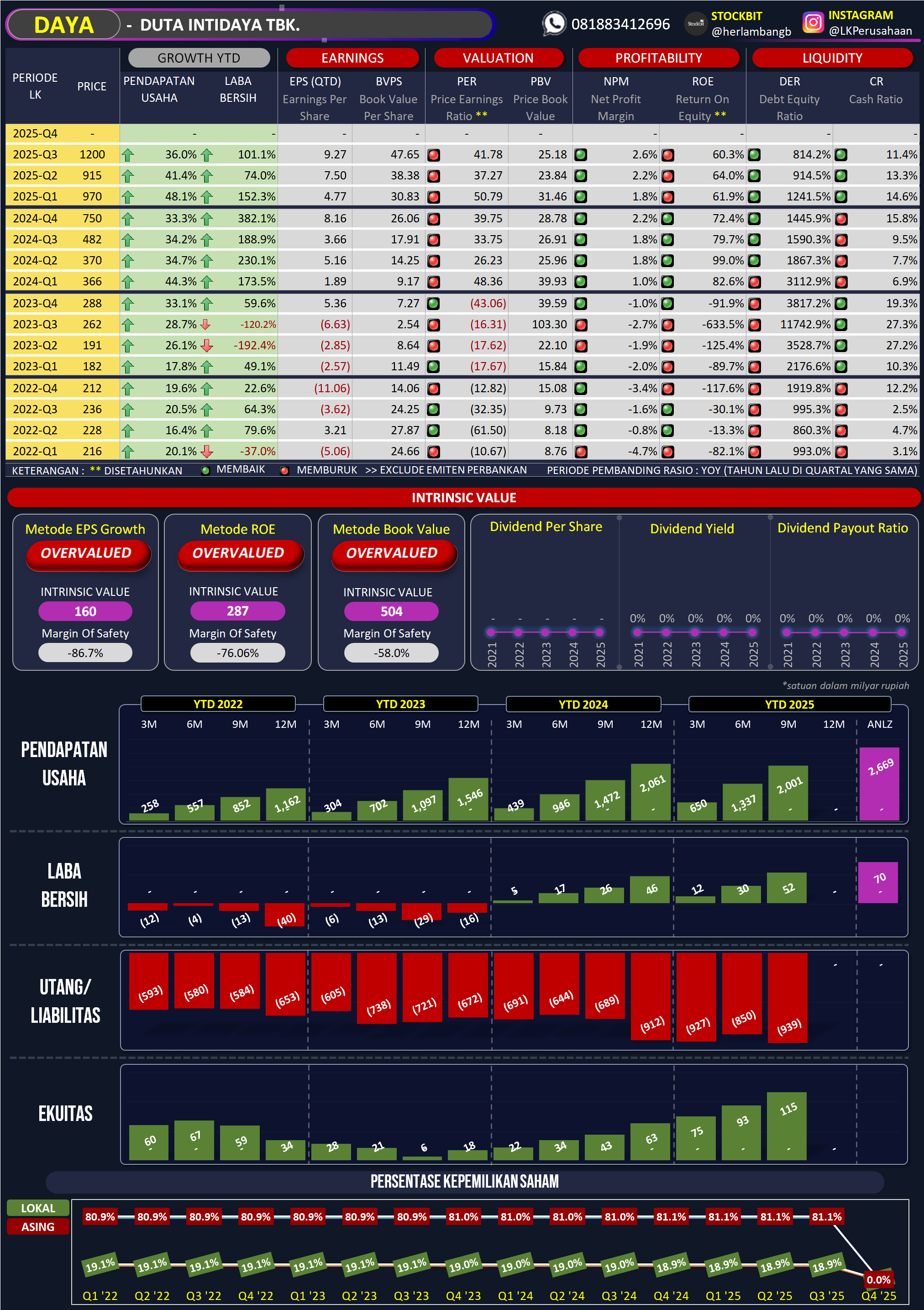 Kinerja Q2-2025: laba bersih +5.42% QoQ ke Rp25,7M, ekuitas naik 11%, posisi kas dan likuiditas sehat (utang turun 69%, aset turun karena pelunasan kewajiban, equity naik); fundamental stabil menjaga minat investor spekulatif (Website Resmi, 31 Juli 2025).