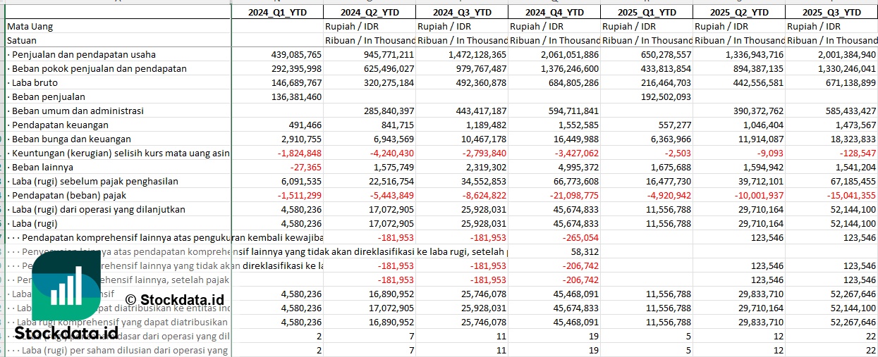 Kinerja Q3 2025 solid: revenue Rp864,82M (+30% YoY), laba bersih Rp87,21M meningkat signifikan, EPS 14,55 (profitabilitas tumbuh kuat).โ