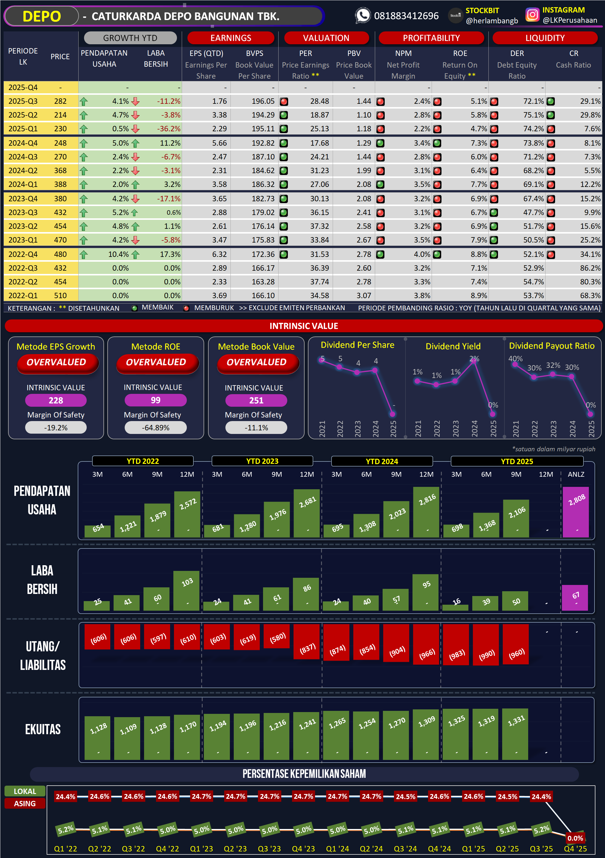 Berikut analisa saham DEPO (PT Caturkarda Depo Bangunan Tbk) berdasarkan data terbaru hingga Q2 2025: