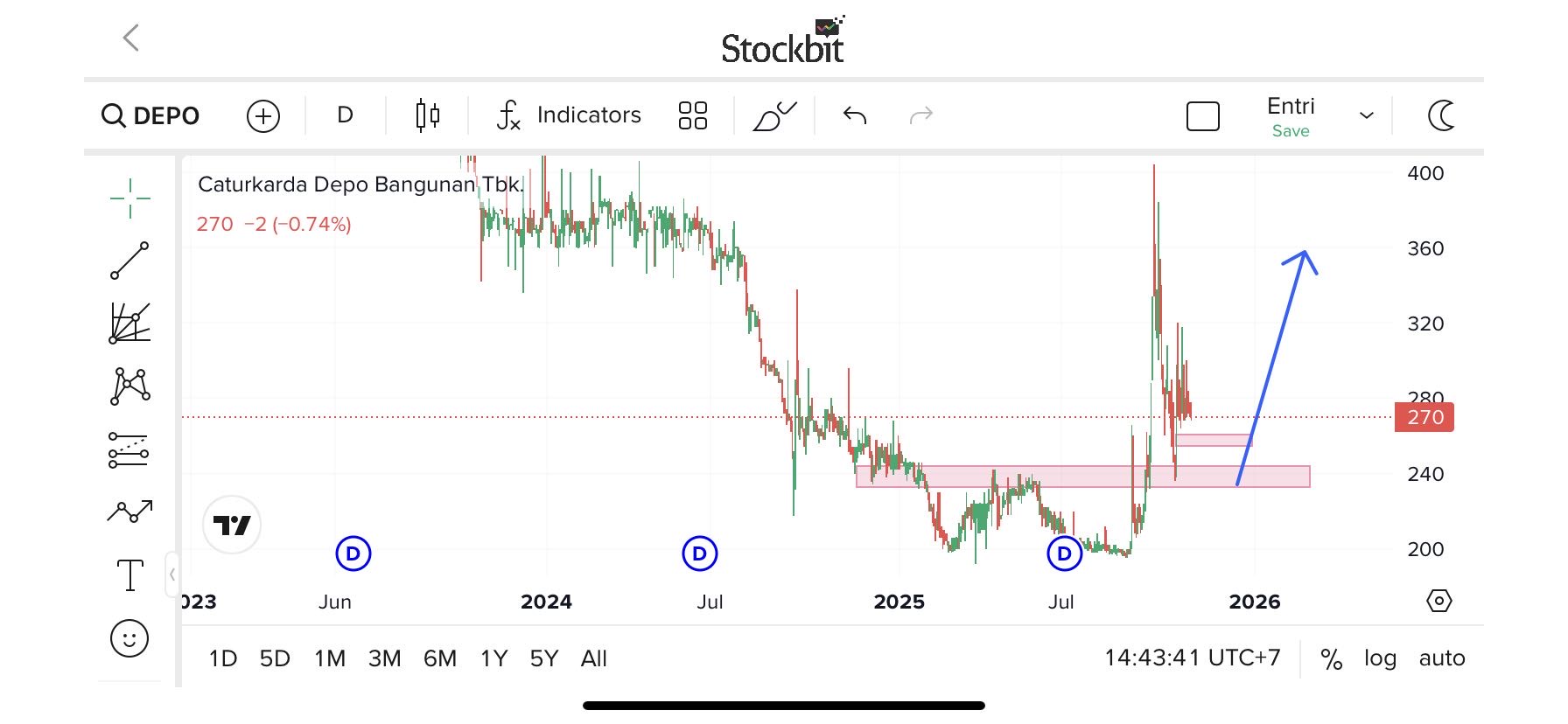Teknikal DEPO dalam fase konsolidasi weak, support EMA masih dijaga, technical rebound short-term mungkin bila volume reversal, swing trader disarankan batch kecil, TP/SL disiplin wajib.
