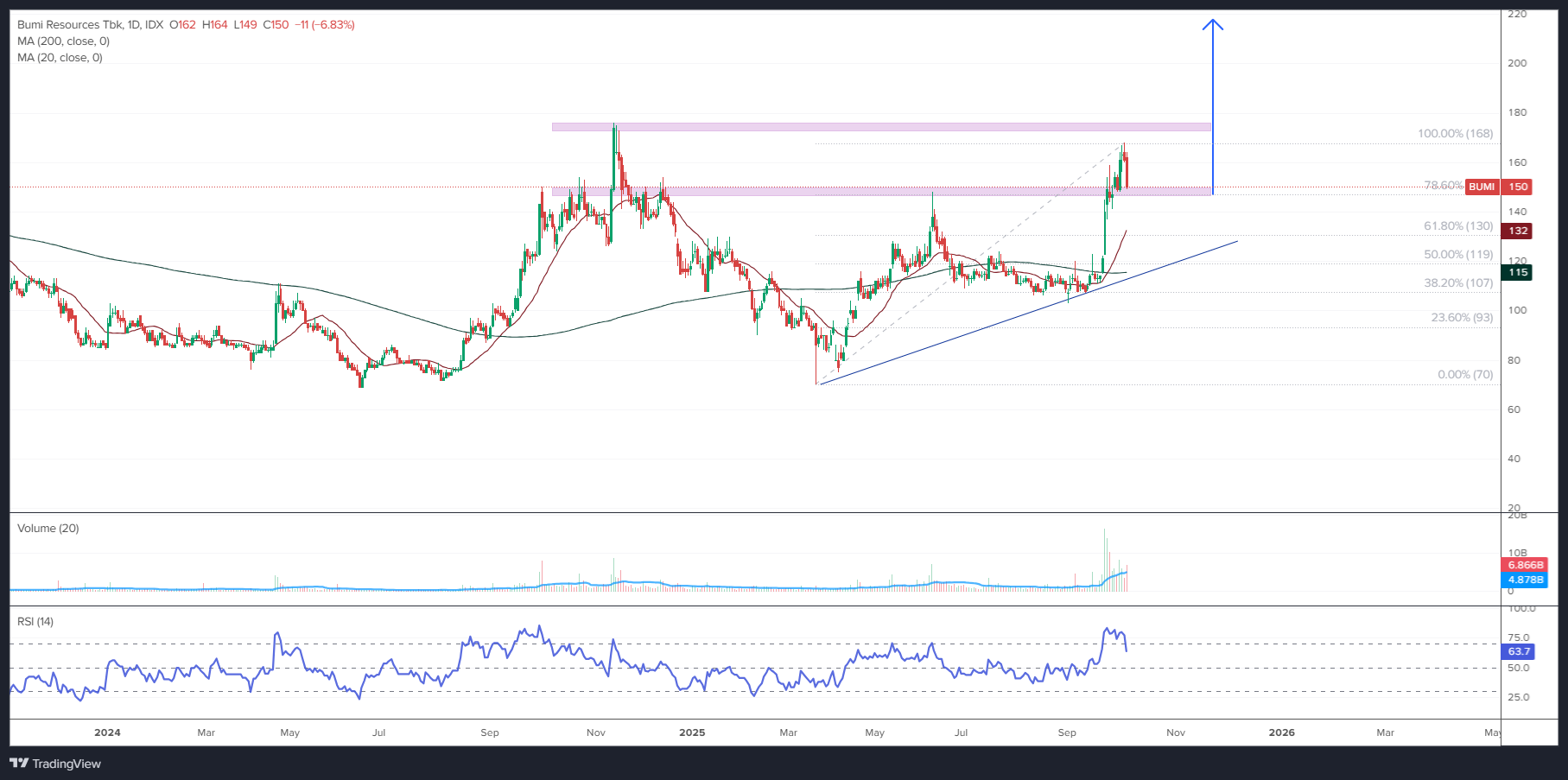 $BUMI hari ini terlihat overall viewnya kurang begitu menarik karena terlihat BUMI hari ini lanjut terkoreksi cukup signifikan hingga saat ini BUMI sudah berada diangka 150, tepat dikisaran area Supportnya yang saat ini ada diangka 148-154 dimana kurang menariknya BUMI ini menunjukkan bahwa sebelumnya BUMI ini masih gagal untuk bisa terus naik n BreakOut dari Targetnya yang berada dikisaran angka 170, Adapun BUMI dalam 3 hari terakhir juga overall terus didistribusikan oleh Pihak Foreign seperti AK n BK sehingga membuat viewnya kurang menarik saat ini.