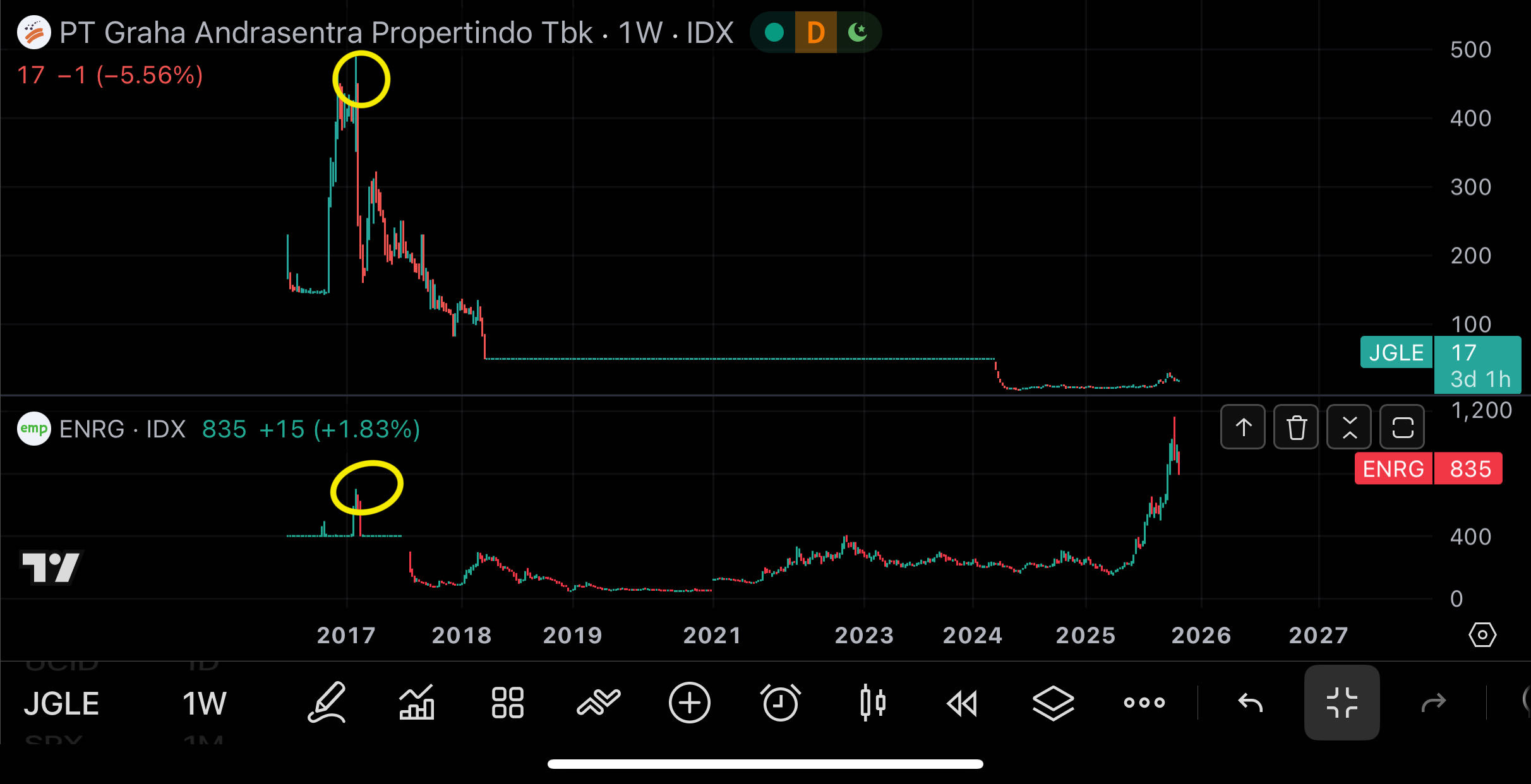 $ENRG sudah melewati ATH tahun 2017, sedangkan $JGLE masih jauh tertinggal di bawah