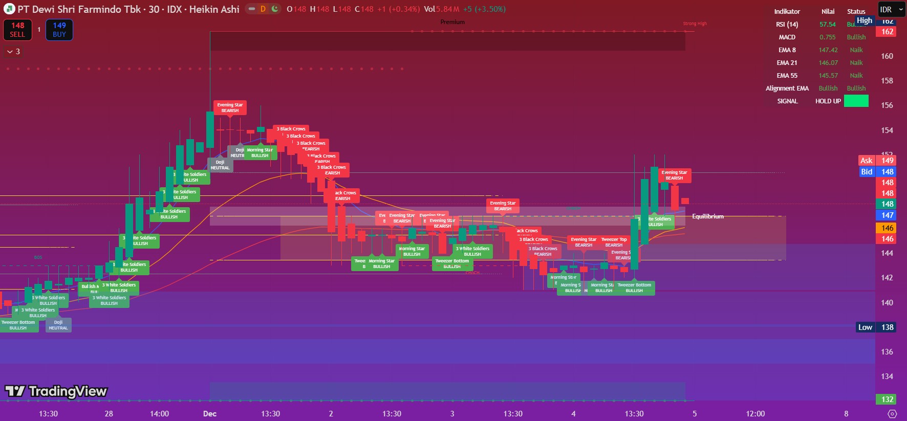 Harga saat ini bergerak sideways di atas EMA 55 (145.57), dengan momentum bullish masih terjaga: