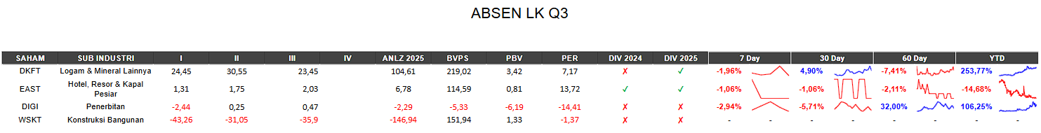 EmitenNews.com - Arkadia Digital Media (DIGI) kuartal ketiga 2025 boncos Rp2,79 miliar. Bengkak 27,39 persen dari episode sama tahun sebelumnya minus Rp2,19 miliar. Rugi per saham dasar menjadi Rp1,72 dari periode sama tahun sebelumnya Rp1,35.