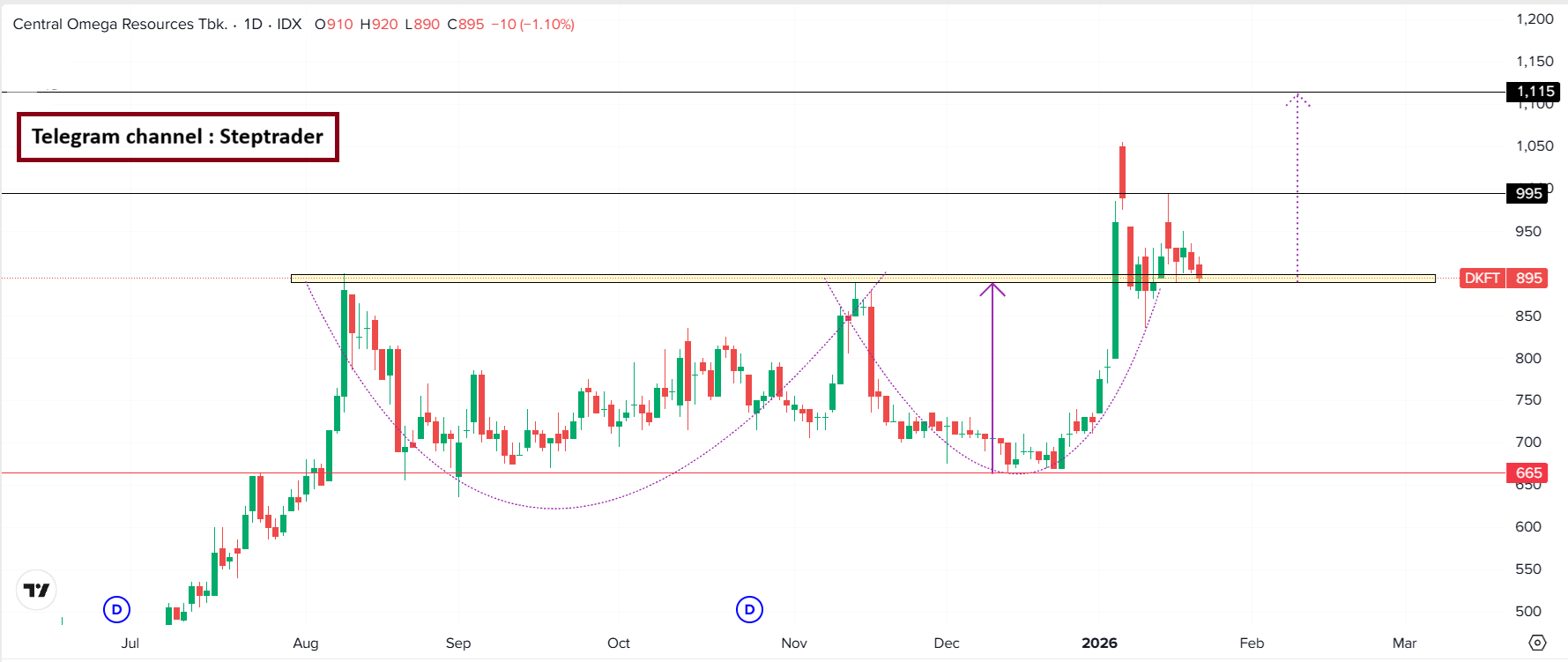 š¹ Namun apabila kembali turun dan gagal bertahan di 870 ketika koreksi, maka $DKFT berpotensi batal rally membentuk pola double bottomnya dan kembali berkonsolidasi.