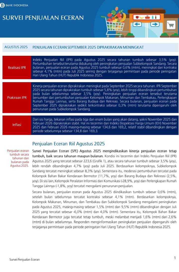 Rilis data penjualan eceran (retail sales) Indonesia Agustus-September 2025 oleh BI