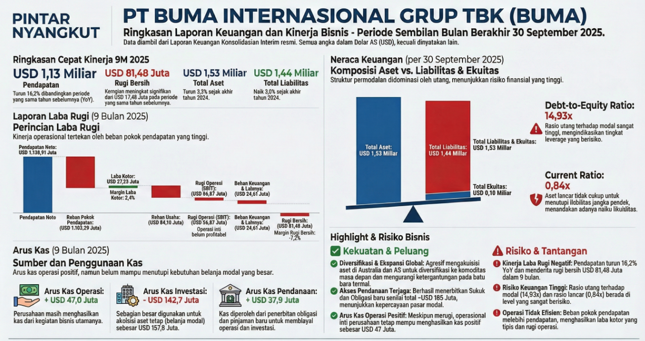 IDXChannel - PT BUMA Internasional Grup Tbk (DOID) masih mencatatkan kerugian USD81 juta atau setara Rp1,33 triliun (kurs Rp16.500 per USD) hingga kuartal III-2025.