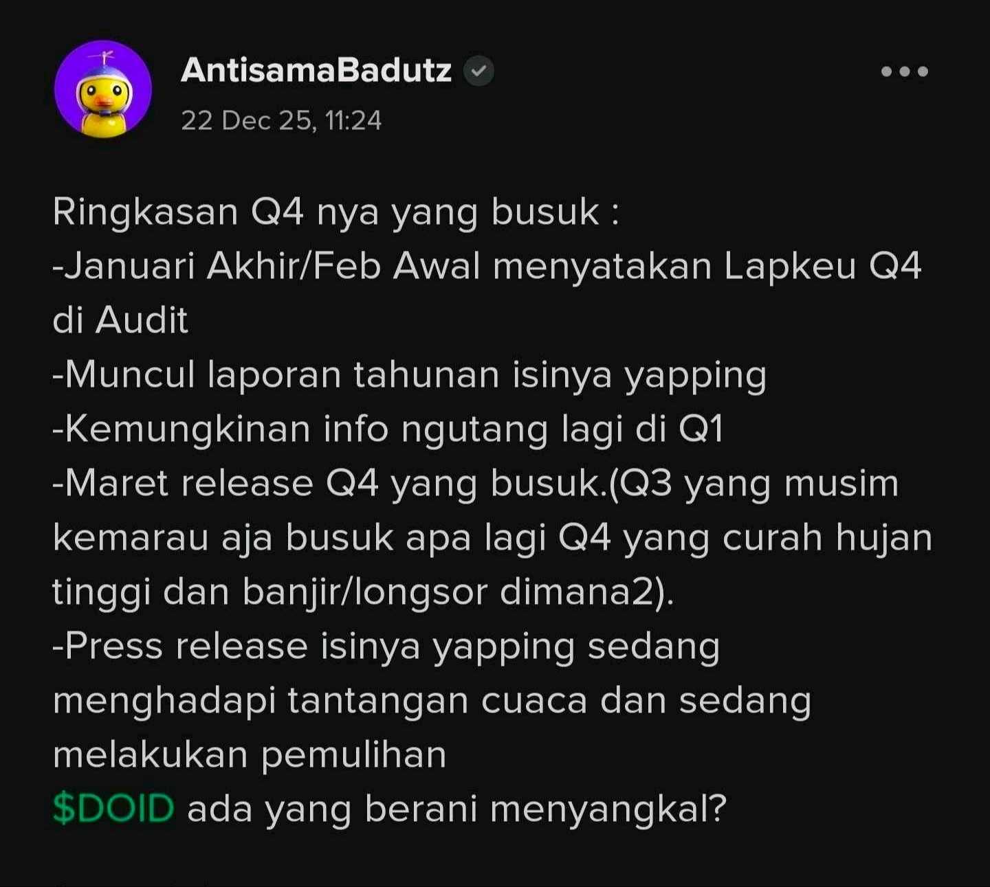 Setiap Quartalan om badut selalu bikin rundown $DOID. Siap2 bentar lagi lapkeu Q4 nya yang busuk itu mau diinfo buat di audit