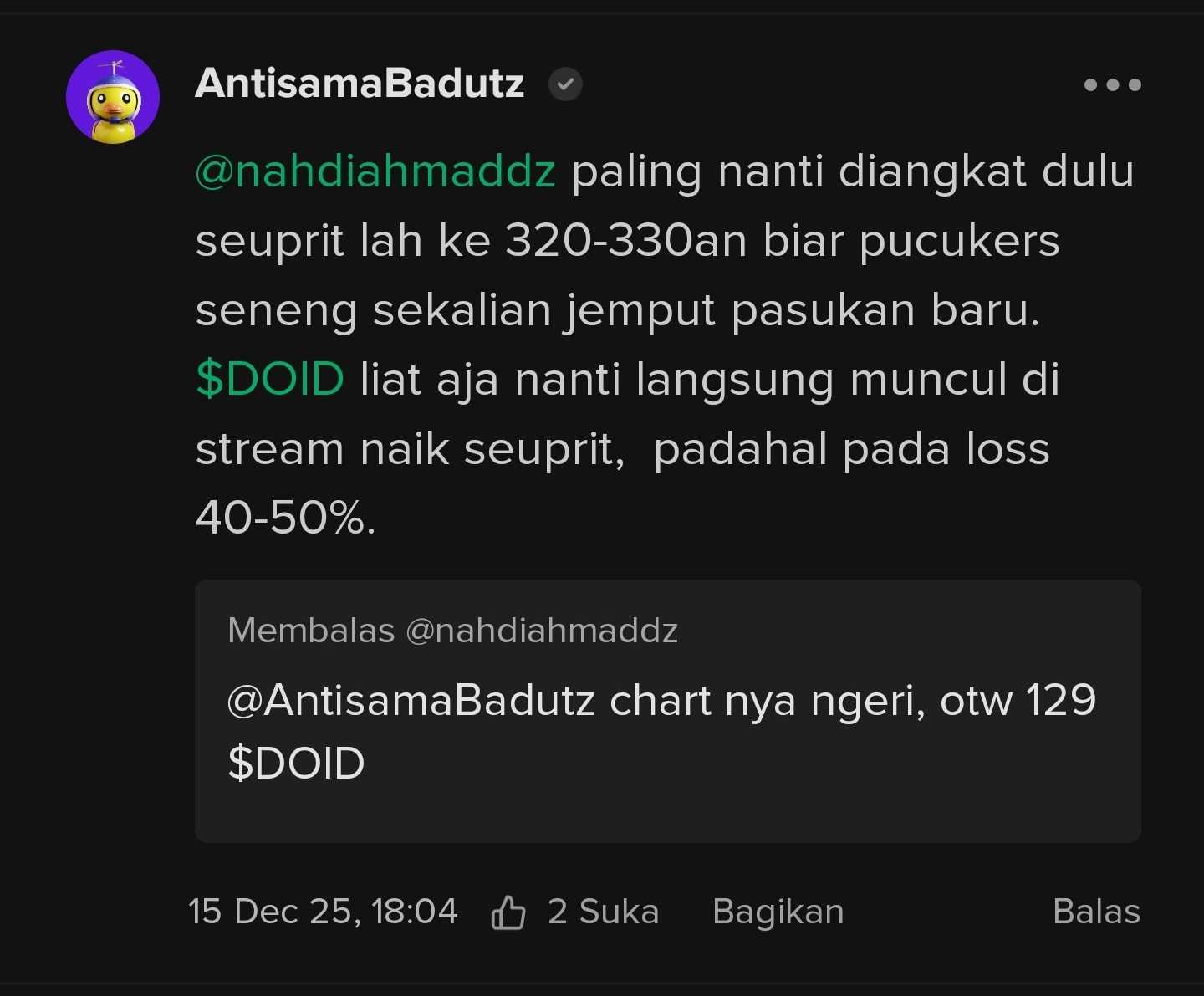 @nahdiahmaddz paling nanti diangkat dulu seuprit lah ke 320-330an biar pucukers seneng sekalian jemput pasukan baru. $DOID liat aja nanti langsung muncul di stream naik seuprit, padahal pada loss 40-50%.
