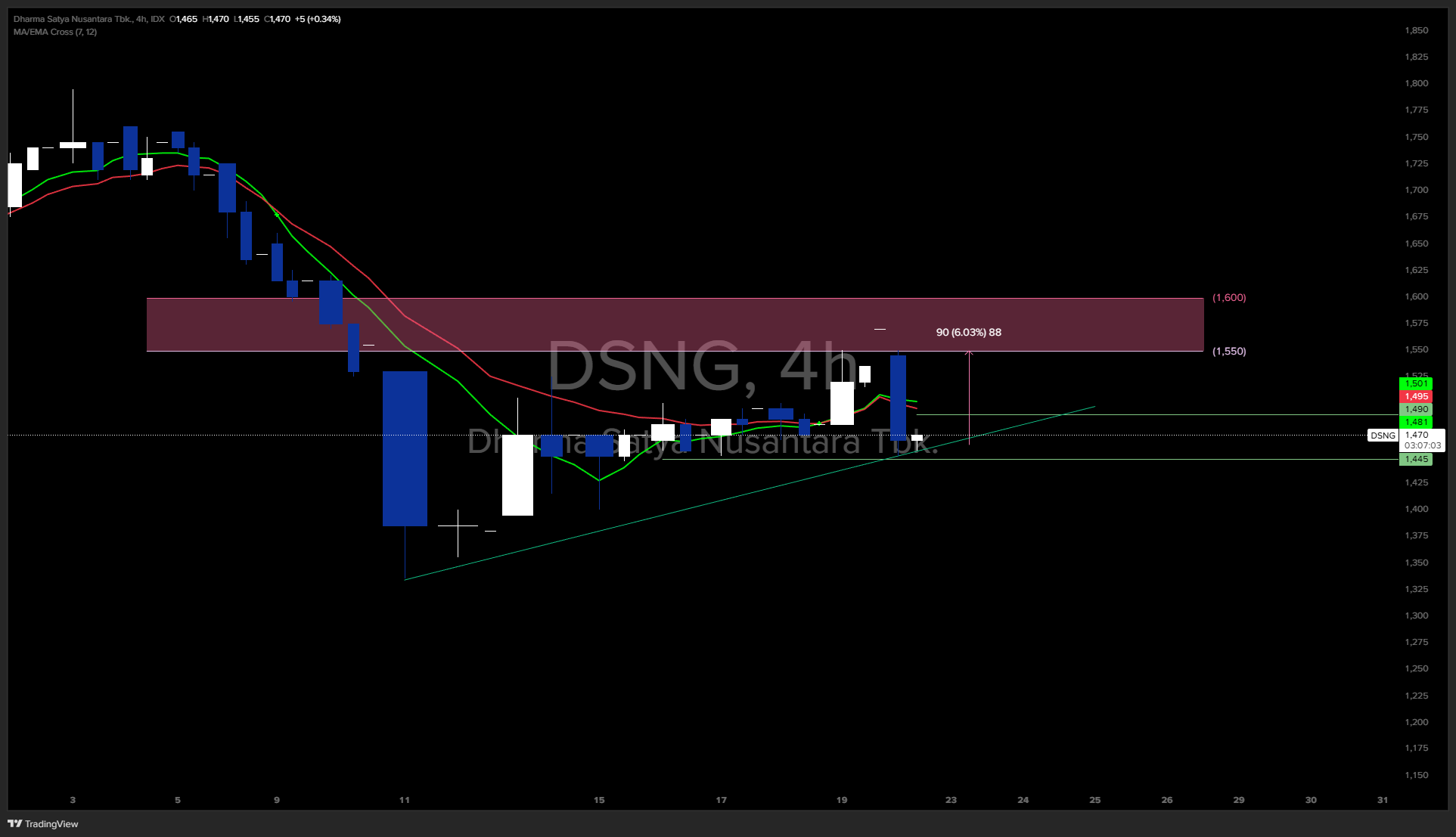 Trigger: Buy on Weakness/Pantulan MA ketika harga mendekati 1.380–1.430 dan memantul dengan candle reversal kuat (hammer/bullish engulfing) diikuti volume meningkat namun masih lebih rendah dibanding volume jual saat breakdown dari 1.600–1.700; preferensi tambahan bila muncul sinyal stabilisasi harga CPO (HR CPO tidak turun lagi, harga futures mulai menguat) dan update kinerja kuartal yang tetap solid.