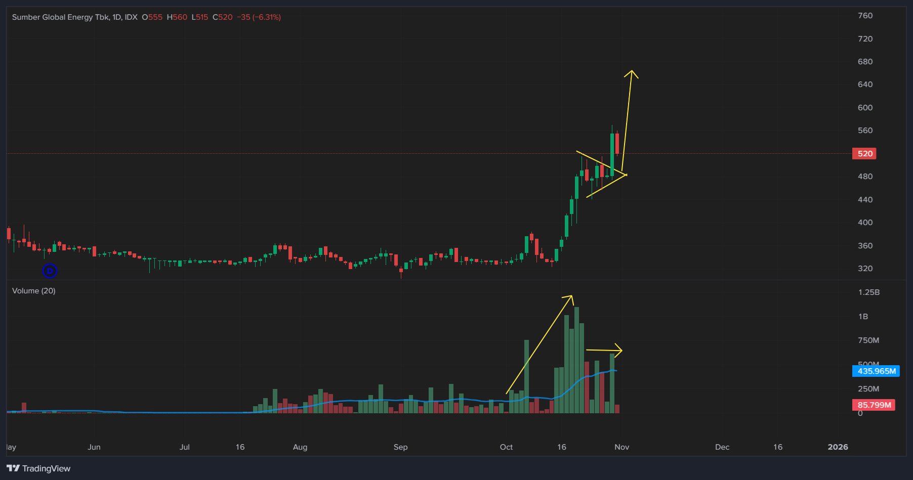Volume Perdagangan: Volume perdagangan meningkat tajam, menunjukkan adanya partisipasi investor besar.